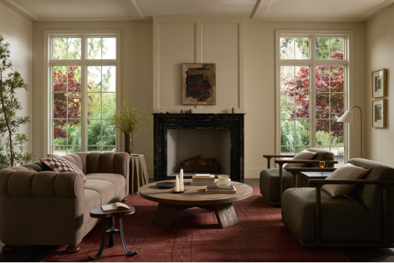 多年來,我們一直在報道色調從冷灰和白向更深、更暖的色調轉變,這一趨勢在秋季展上得以延續。雖然上一季流行的灰藍色和鼠尾草綠色仍然非常受歡迎,但有幾抹色彩尤其突出,構成了2026年的色彩主題:橄欖綠與冷杉綠、棕色、赭石色與紅紫調梅子色,正如這款Loloi Beckham地毯所展示的那樣。