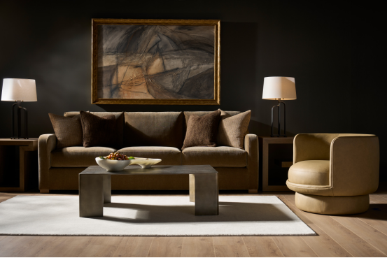 Universal Furniture的這個展示區,以Deke轉椅和Filmore沙發為特色,捕捉了在許多展廳中普遍存在的棕色、大地黃和深暖調金屬色。許多棕色帶有偏紫或偏灰的底色——后者用途廣泛,足以與暖色調或冷色調和諧共處。