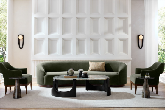 例如,緊致包覆的、受裝飾藝術風格啟發的軟墊長椅式沙發(如圖中Arteriors展示區內的Turner沙發)無處不在,通常覆以華麗的松綠色、棕色或啞光莓果色面料。而前面提到的許多傳承圖案,其流暢的、源于自然的線條正是新藝術運動設計的標志。