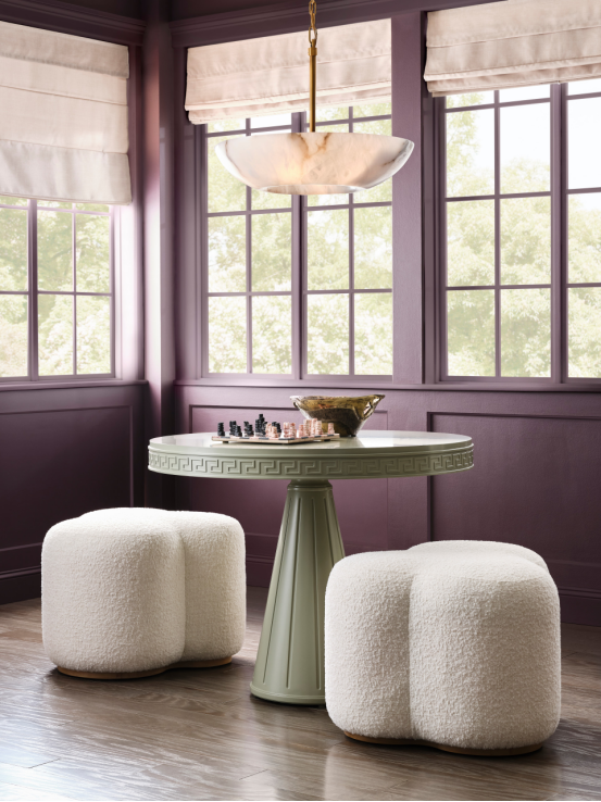 一種非常具體、彎曲(且可愛)的形狀似乎突然無處不在,那就是三葉草(苜蓿形)。三葉和四葉形圖案出現在墻紙和布料圖案、燈具、座椅背以及腳凳上,如圖中Wildwood的Andrea腳凳。我們很想知道這個形狀在春季展上是否會繼續流行。