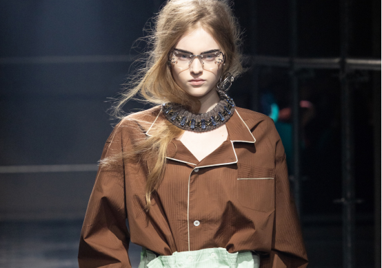 本季,睡衣造型同時出現在Prada的男裝和女裝秀場上,這是聯合創意總監Miuccia Prada和Raf Simons持續探索衣櫥原型的一部分。以其標志性的獨特風格,秀場上的睡衣套裝搭配了牛仔靴——仿佛深夜去街角小店一般;而在女裝秀上,睡衣襯衫則被擰起,變作臨時的裙裝。