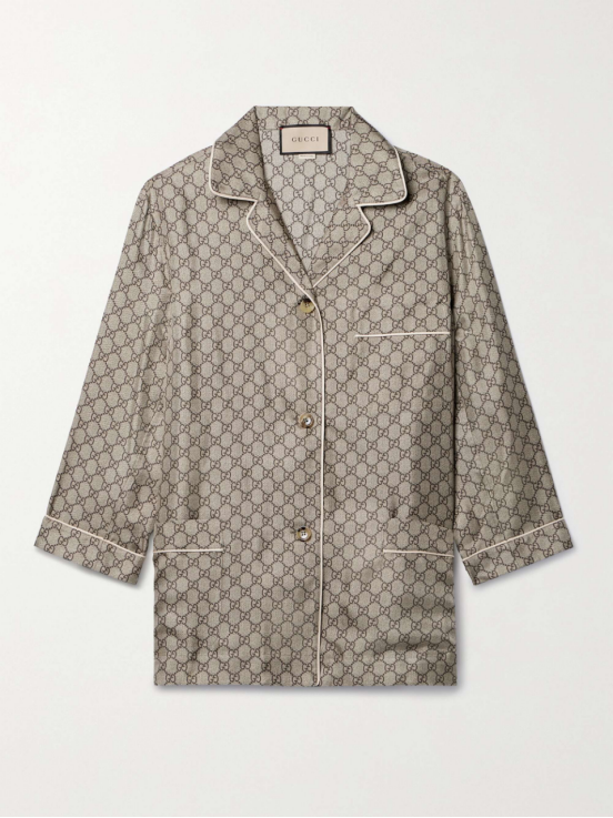 今年早些時候,Gucci慶祝了其互扣式雙G標志誕生50周年,這個由Aldo Gucci為紀念其父親Guccio Gucci而創造的標志長久以來一直是這家意大利品牌的象征。在此,它裝飾于一件絲緞提花睡衣襯衫上,盡顯Gucci獨特的意式閑適優雅。