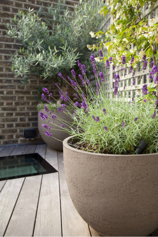 "您可以通過擺放植物將自然帶入您的戶外空間,即使只是一個很小的門口區(qū)域," Gold 說,她為自己花園選擇的香味植物是茉莉。在圖中這個倫敦的屋頂花園里,Jonathan Snow Design 在花盆中種植了薰衣草和茉莉。為您的戶外空間增添芬芳,可能只需要投入一株植物和一個花盆那么少的成本。