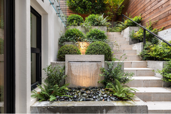 因此,studio dre 將這處噴泉放置在舊金山一所公寓的家庭辦公室外。它邀請房主在工作間隙休息一下,或到戶外接個電話,呼吸一些新鮮空氣,從陽光中獲取維生素D,并讓水聲和植物景觀撫慰心靈。