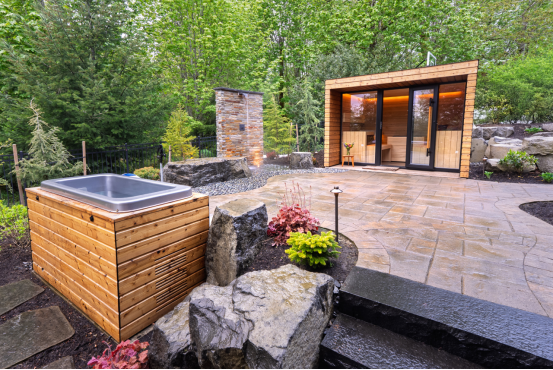 在圖中這個位于西雅圖郊外的院子里,Alderwood Landscape Architecture and Construction 在一個健康區(qū)域里包含了桑拿房、冷水浴池和一個露天戶外淋浴間。三者由照片左側可見的卵石小徑連接;卵石在赤腳下感覺非常美妙。