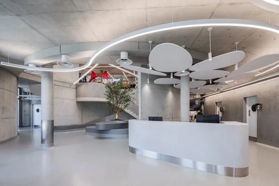最初看似簡單靜態的幾何形體——植根于空間心理與人類學原則——逐漸展開為一個充滿動感的曲線網絡,使這里成為一個真正的“場所”,充滿生命與流動感。這些流線型的形式消除了人們對封閉空間的原始恐懼,營造出一種開放而自由的環境。