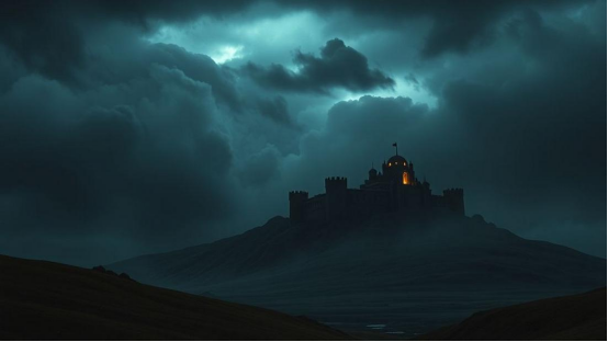 (提示詞:"暴風雨夜空下,遠處山丘上一座孤寂的堡壘在發光")