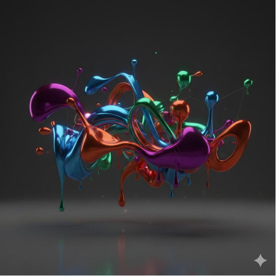 (提示詞:"懸浮在半空中的彩色液態金屬形狀的抽象3D構圖,高細節,影棚燈光")