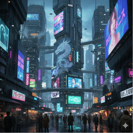 (提示詞:"一座受東京和《銀翼殺手》美學啟發的未來城市")