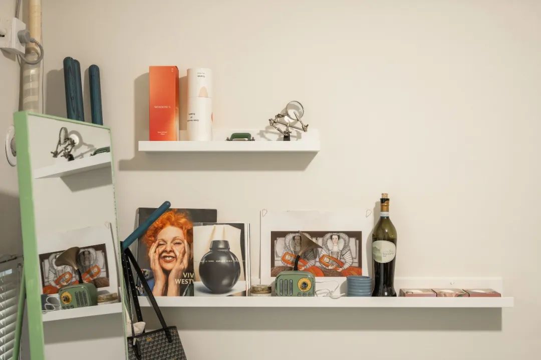 旁邊較為矚目的是用大面積玻璃和鏤空隔斷圍合起來的工作間,同時(shí)這里也充當(dāng)了櫥窗。內(nèi)衣設(shè)計(jì)的起點(diǎn)和終點(diǎn)都濃縮在這一空間。所有材料、設(shè)計(jì)稿、縫制工具有序排列,設(shè)計(jì)過程中產(chǎn)生的凌亂又為它增添生動(dòng)可愛的一筆。