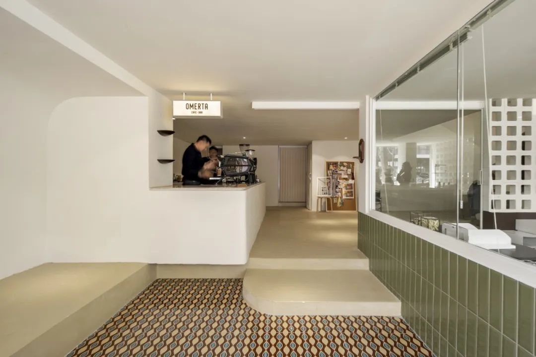 其整體空間分為上下兩層,二樓作為辦公區(qū)和倉庫,一樓則包括咖啡區(qū)、工作間、展示空間和試衣間。踏入一個(gè)鋪滿復(fù)古磚的下沉式空間,OMERTA CAFE&BAR作為“店中店”,延續(xù)了自身恰到好處的復(fù)古感,以一盞簡(jiǎn)潔的燈箱巧妙地融入VOIMENT。