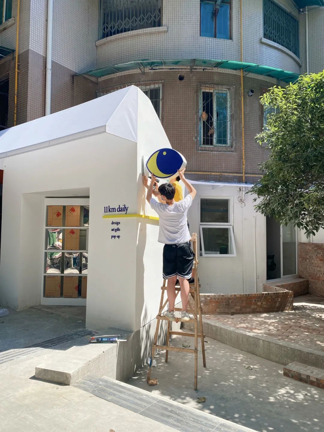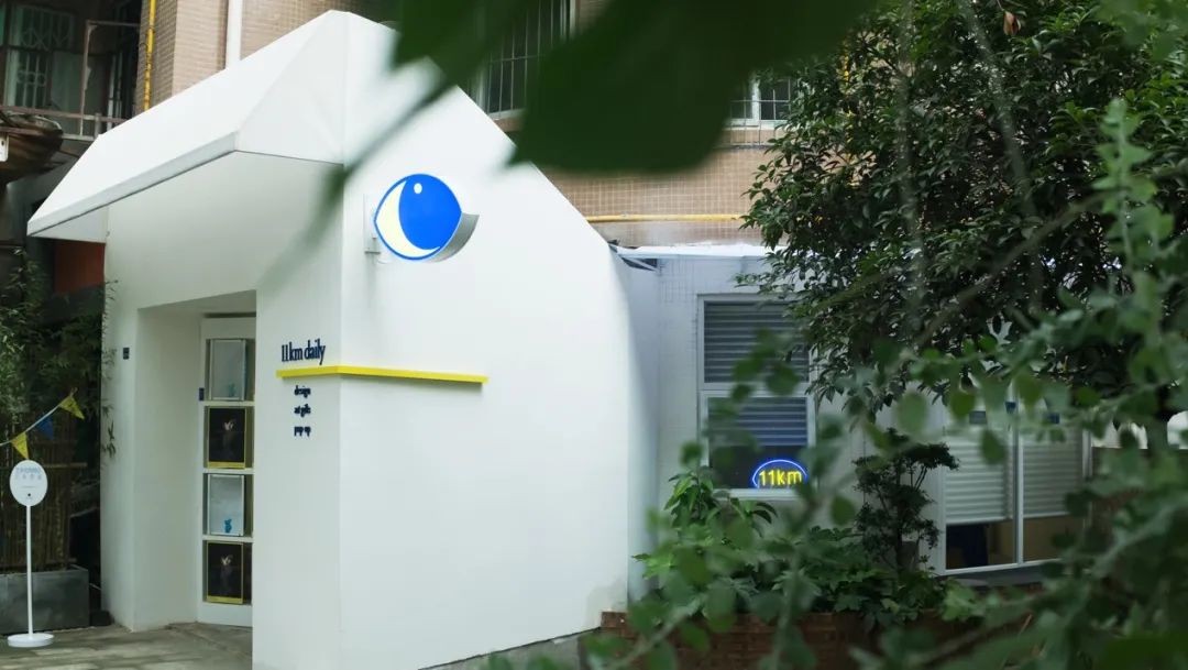 如今芳華街的沿街鋪面已經開滿了各式各樣的特色小店,但11km daily在居民樓和一系列咖啡館、餐館的包圍下,依舊白得扎眼。精致小巧的斜屋頂,除了白就只有招牌的檸檬黃和藍色,嵌進灰撲撲的街道里,很難不讓人注意。