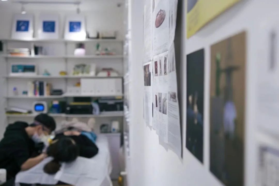 另一個入口隱藏在栽著桂花樹的小院里,是一面落地窗,踩著階梯進去,就是kk的文身工作區,墻面白凈,規規整整貼著一些海報和照片,沒有四處懸掛著用精致重工畫框裱起的文身手稿,沒有到處擺放的文身椅。