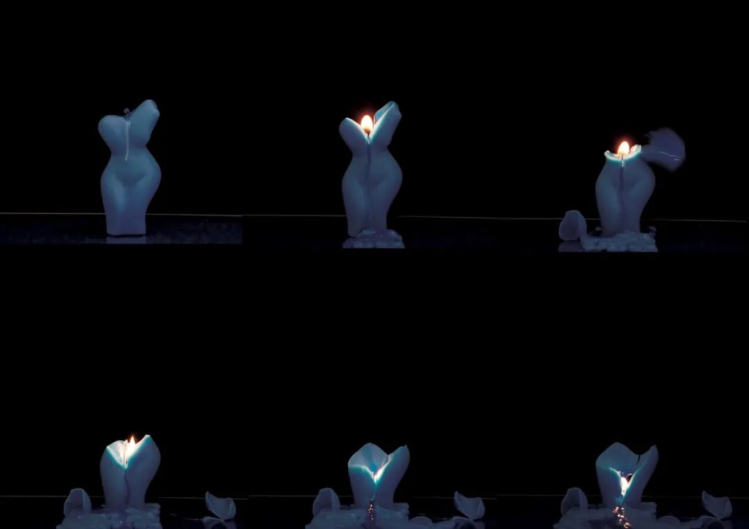 女性柔美的曲線,伴隨蠟燭被點燃,變換為如小溪般的蠟液,流淌過小腹、兩腿之間,緩緩消融,在膝邊匯聚成一灘凝固的流水。“你會看到流動的線條,感受到涌動的力量,不同的觀感組成一幅幅關于女孩形象的定格?!?/p>