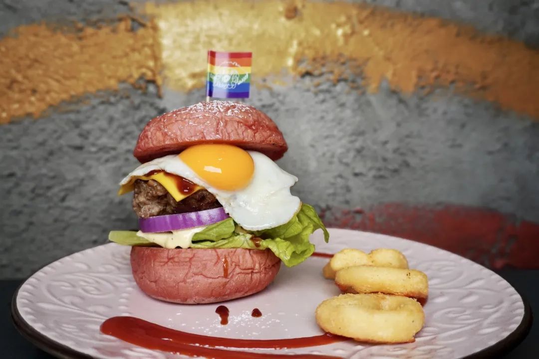 有心人還是可以在店里發現一些暗號,比如衛生間滿墻的彩虹貼紙,特定月份贈送的彩虹棒棒糖,配餐薯餅是擠眼圖案(注:擠眼是多元女性社區“熱拉”的一個熱門功能),漢堡上的彩虹小旗,以及更多顏色選擇的漢堡面包。