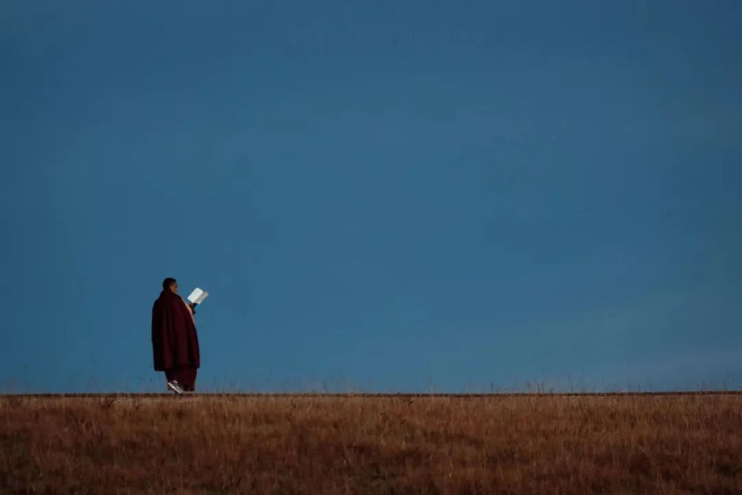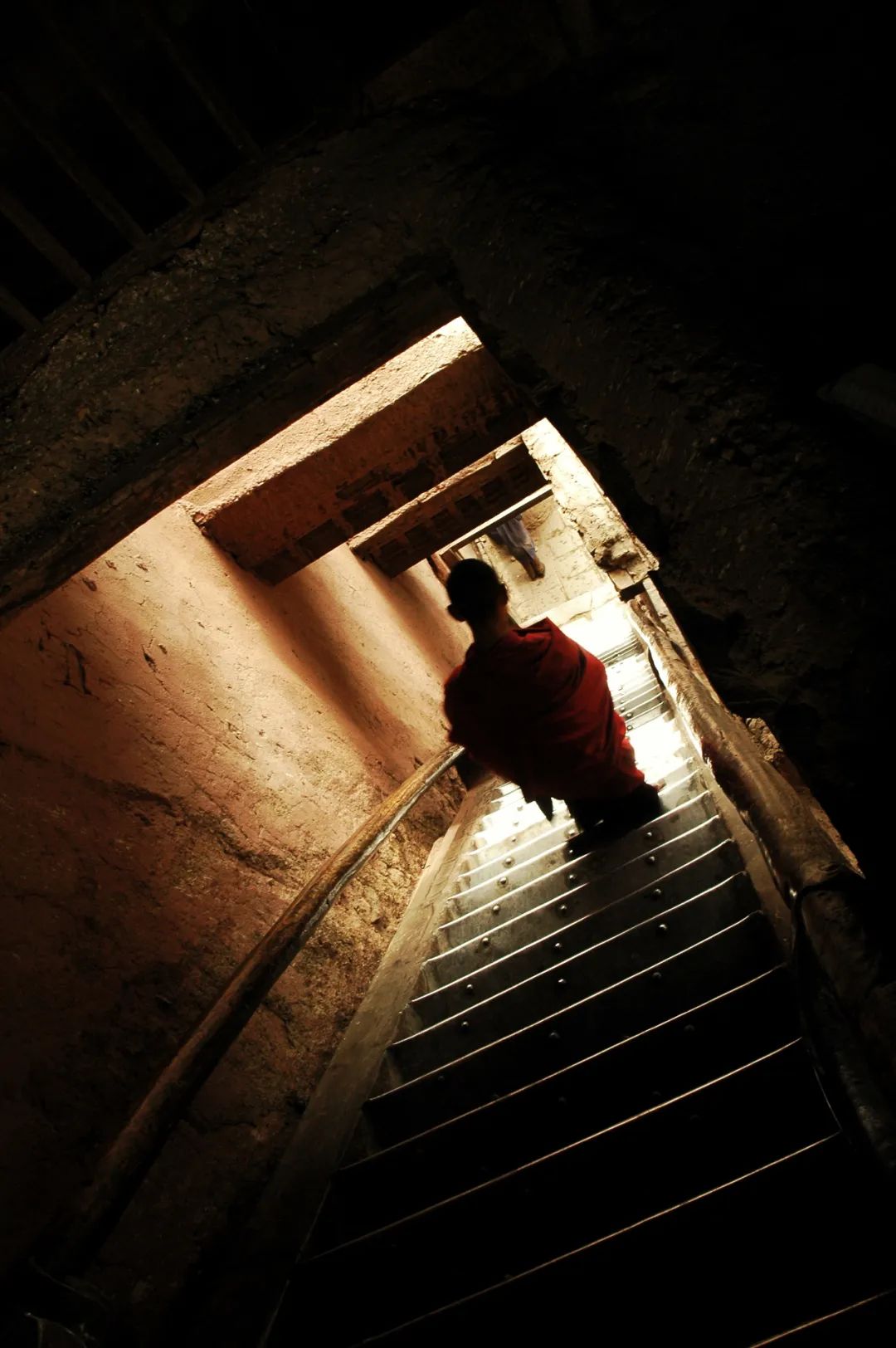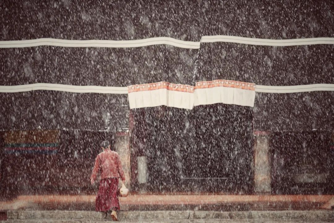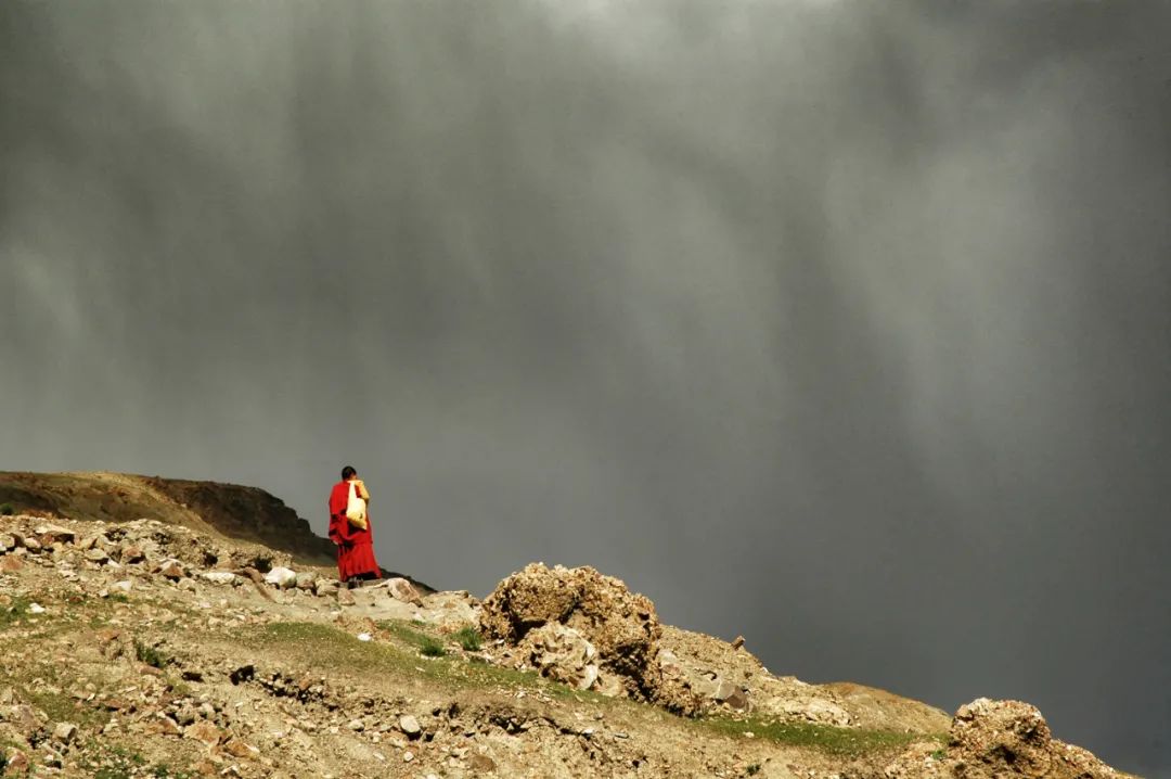 薩迦南寺,一位18歲的覺母下山采購(gòu)。買了一小袋蘋果,在山雨欲來之前,用袈裟擦干凈一個(gè)蘋果遞給我,帶著羞澀的笑容轉(zhuǎn)身離去。夕陽(yáng)的金光依舊照耀在她身上,而她無(wú)所畏懼地朝著濃墨重彩的雨霧中走去。