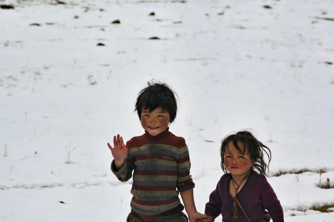 甘孜龍燈草原,雪地中的孩子,遠(yuǎn)遠(yuǎn)地看著我打招呼
