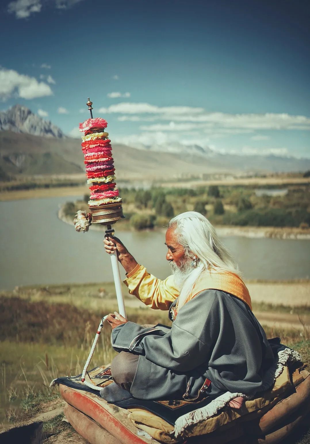 62歲的白瑪次仁叔叔,在317國(guó)道路邊為旅人祈福已經(jīng)23年了,日復(fù)一日坐在蒲團(tuán)上。在雪山下,在江畔,為旅人念誦蓮花生心咒,愿為眾生消除業(yè)障,愿世界和平。
