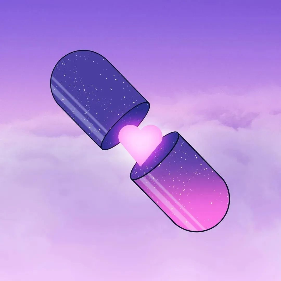 從藥丸內彈出來一個發光的心,跟專輯的名字「Back in Love City」完美搭配。