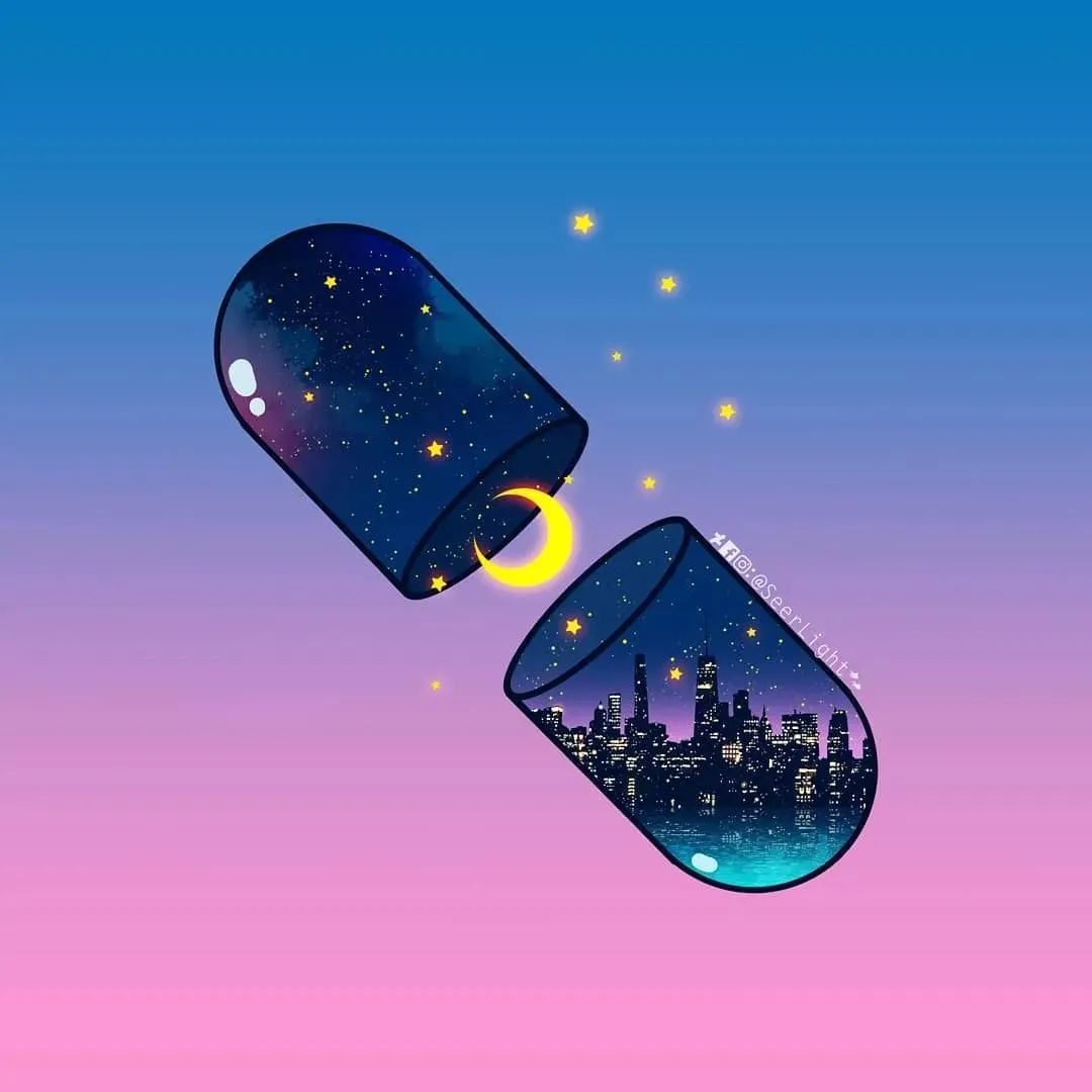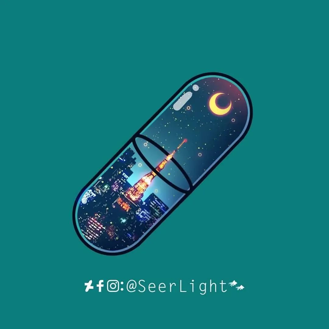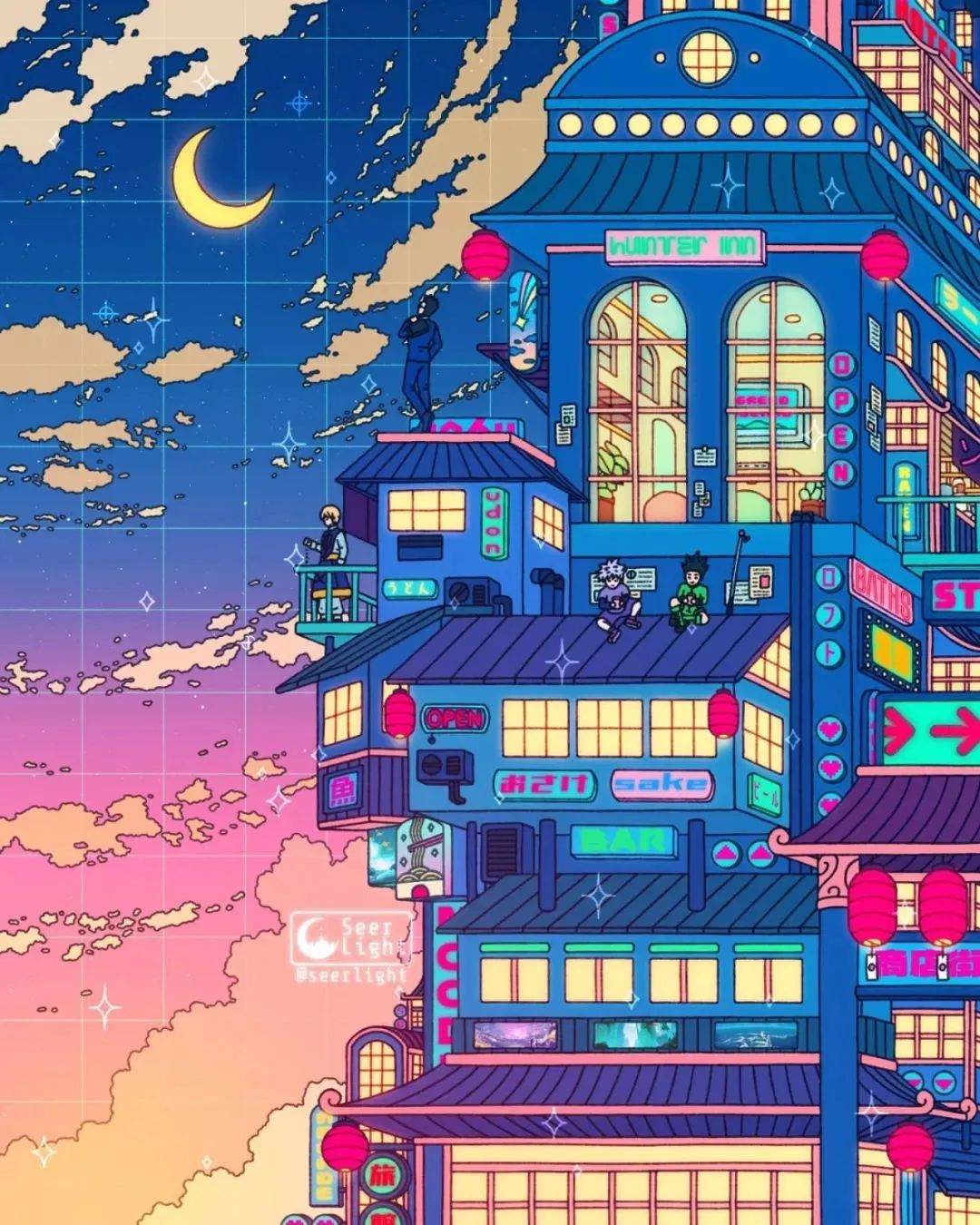 插畫師?Seerlight?的畫風極其具有個人特色 ,夢幻的色彩搭配引起極度舒適,用賽博朋克的風格治愈每一個壓抑的夜晚。