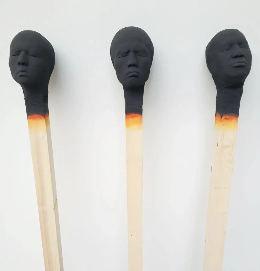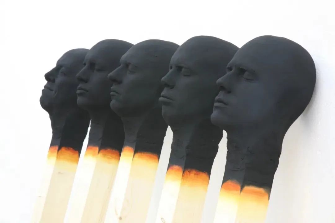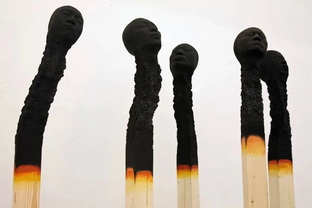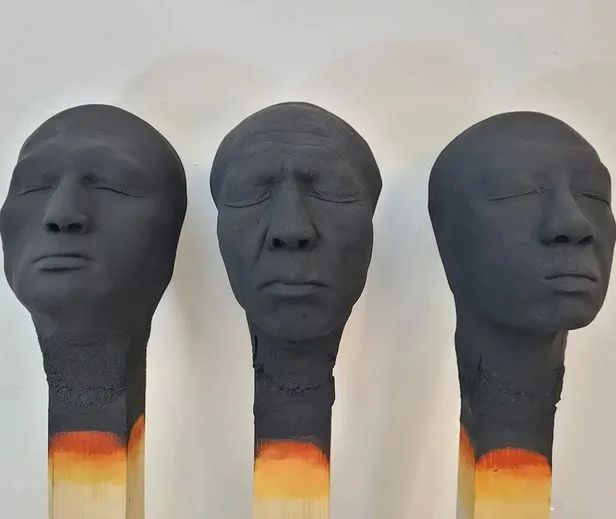 每個雕塑碳化的人頭模型,精雕細刻出形態各異的面孔,遠看是一個個焦黑的火柴棒。