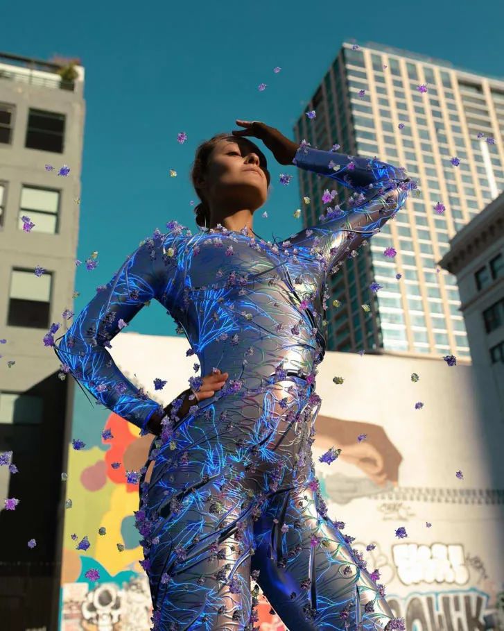 在未來,Newsfeed上頂流博主和明星的服裝造型可能是完全虛擬/虛擬現實結合的;3D模型師就像今天的造型穿搭師一樣為你一鍵換裝。利用混合現實設備,一個人可以操縱自己不同形象的虛擬人(avatar)同時參加三個宴會或時裝發布會,而走秀舞臺上的模特很可能是Deepfake功能合成的AI模特。?去年九月,一張蒸汽波鐳射風格的紐約天臺時裝大片火爆了Instagram,The Fabricant——最早專注于數字服裝設計之一的工作室突然出圈。這款造型被命名為“Iridescent”,模仿鐳射PVC材質,創造出飄飄欲仙、反空氣動力學的效果,最終以9500$美金的價格出售給一位亞裔藏家。?The Fabricant,這家創始于荷蘭阿姆斯特丹的設計公司通過3D建模技術制作數字時裝,整個環節中沒有面料、真人模特、T臺設計,純數字化可視展示反而創造出一種獨特的造型感,帶給人“真實服裝無法給予的驚喜。”?