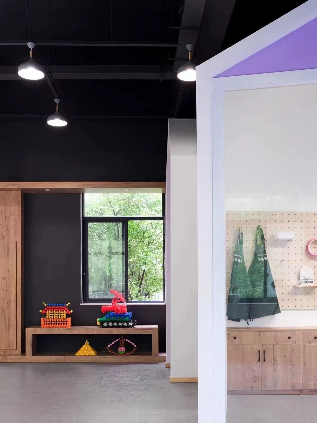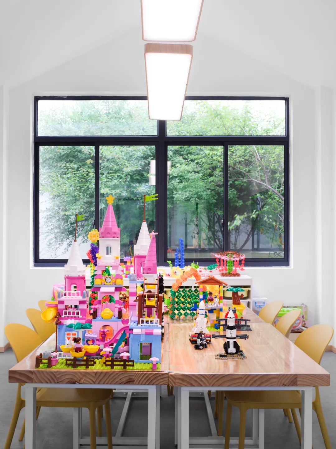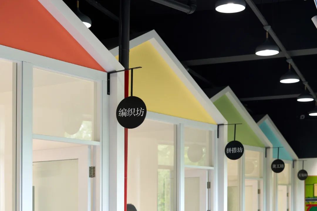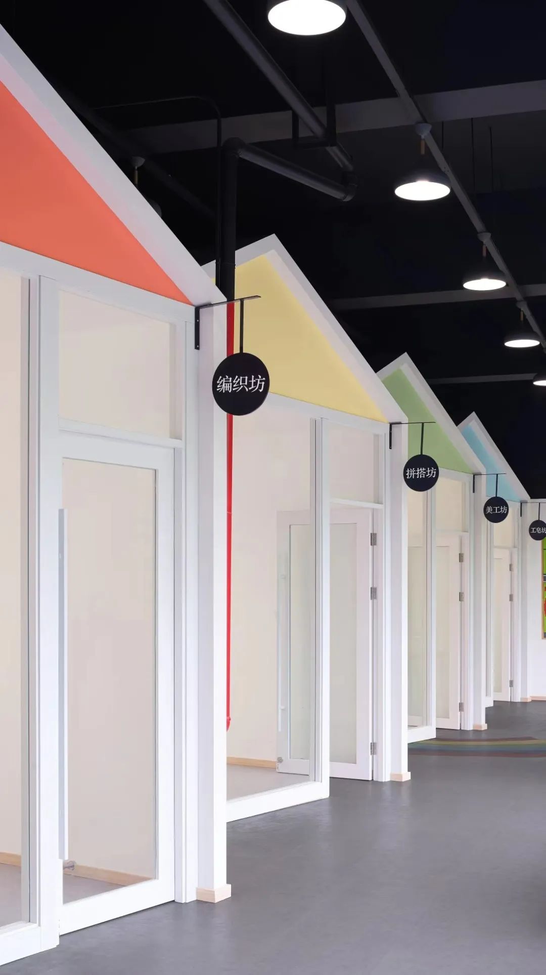 2.?小尺度的空間更容易讓孩子產生安全感,有利于他們安心做手工,因此彩虹坊內部采用“積木”形式,搭建起一個個夢幻尖頂小屋,如同溫暖又致趣的“家”。