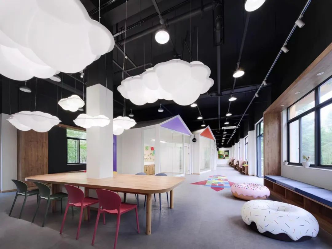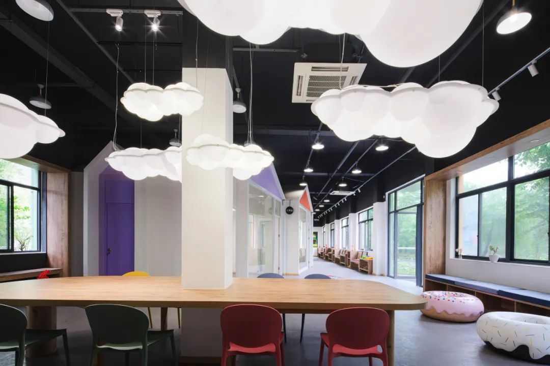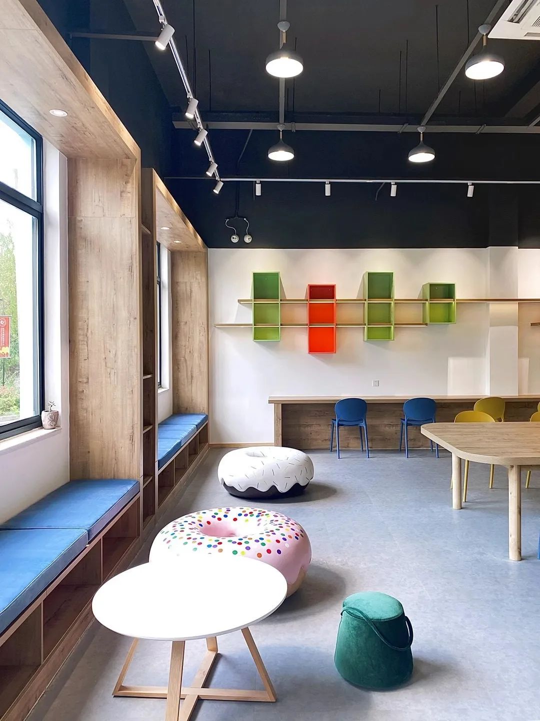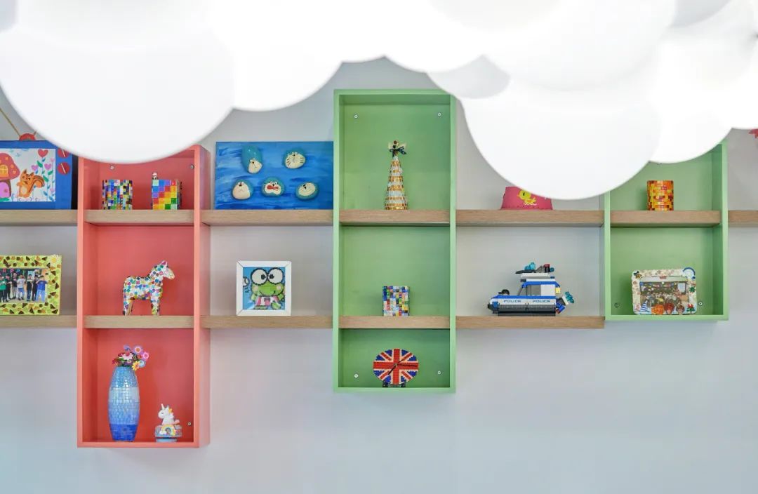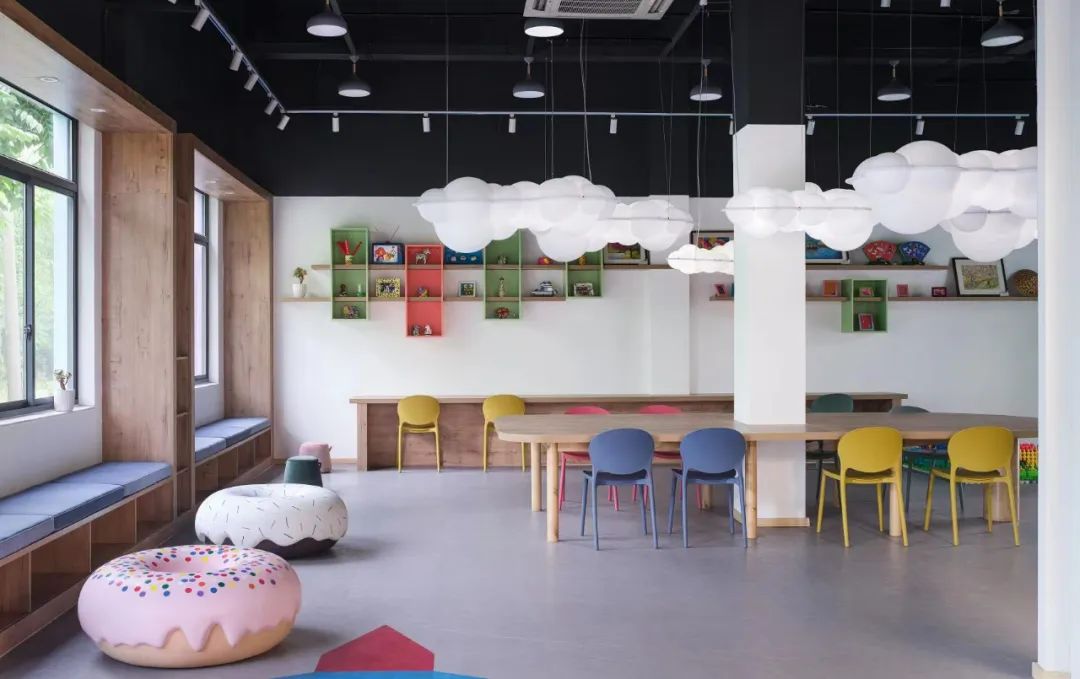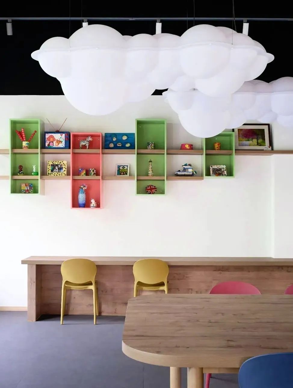2.?小尺度的空間更容易讓孩子產生安全感,有利于他們安心做手工,因此彩虹坊內部采用“積木”形式,搭建起一個個夢幻尖頂小屋,如同溫暖又致趣的“家”。