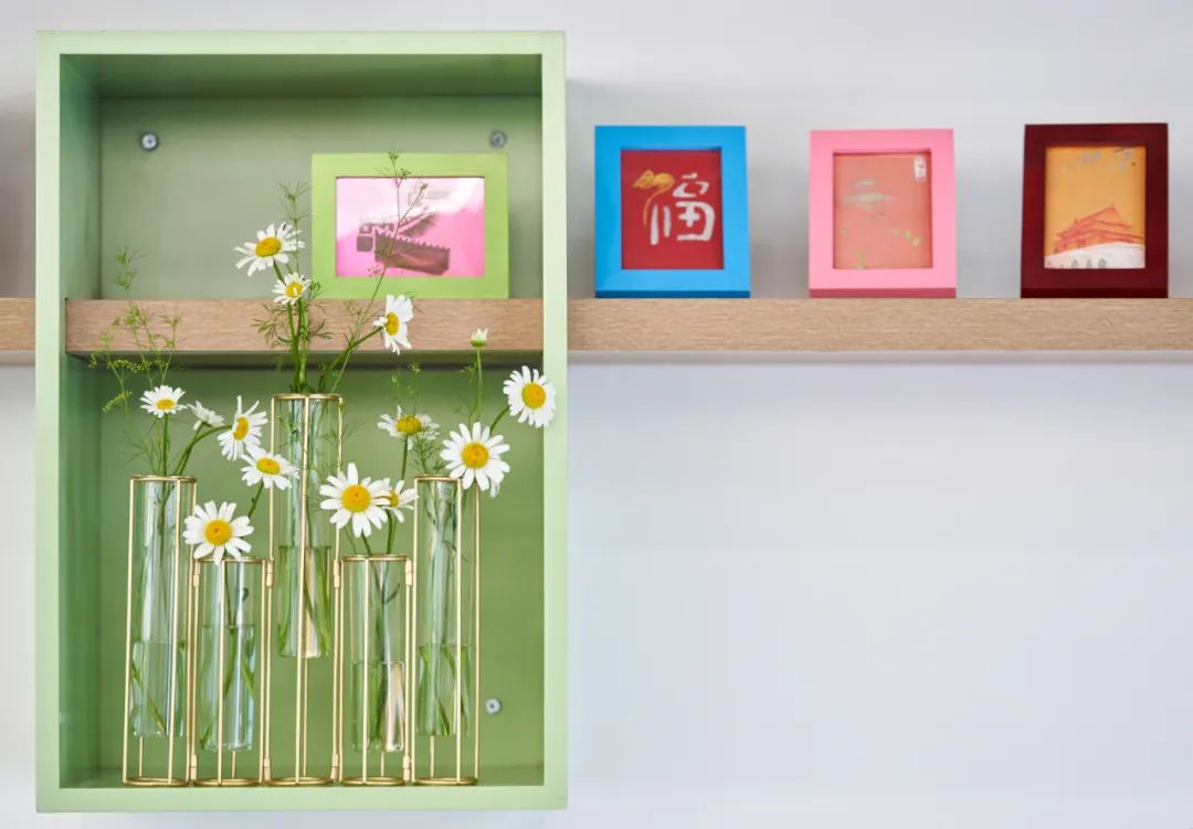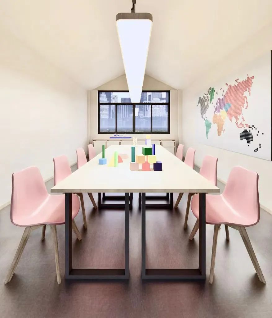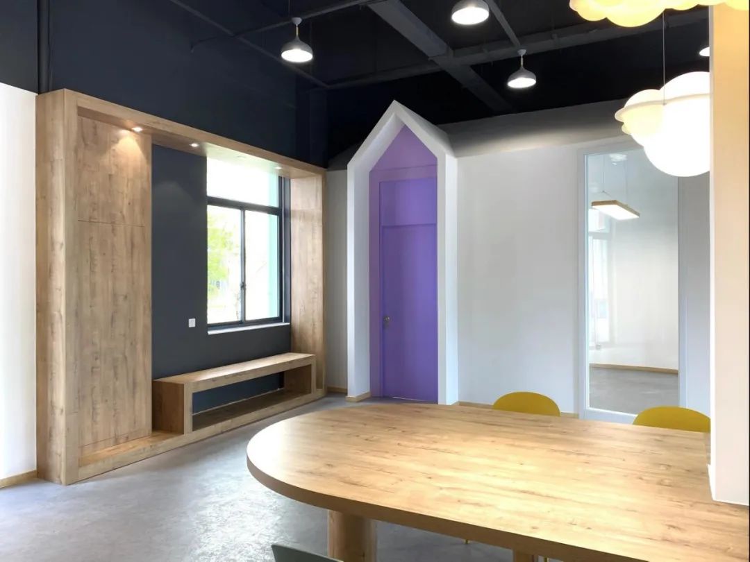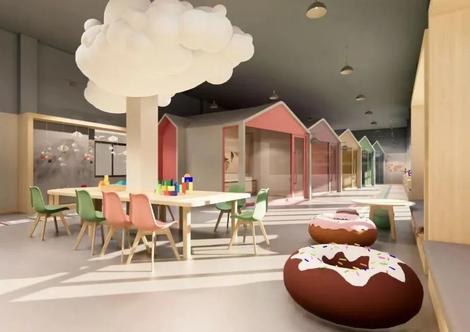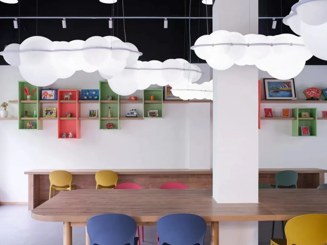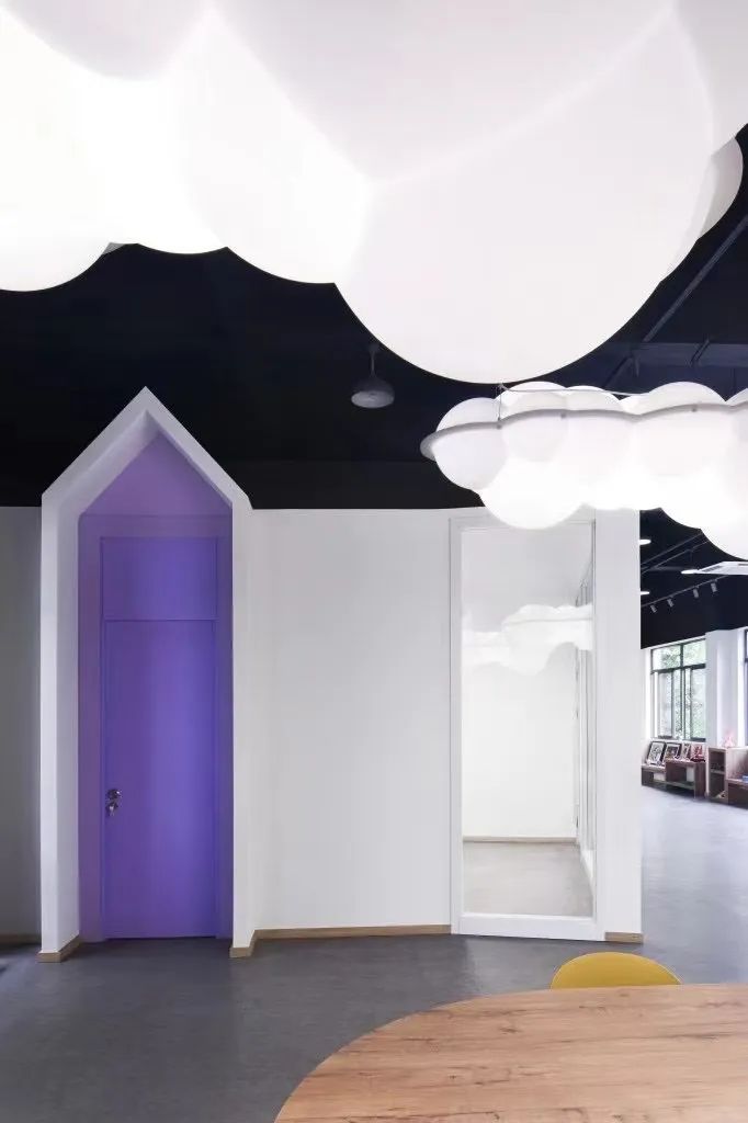 2.?小尺度的空間更容易讓孩子產生安全感,有利于他們安心做手工,因此彩虹坊內部采用“積木”形式,搭建起一個個夢幻尖頂小屋,如同溫暖又致趣的“家”。