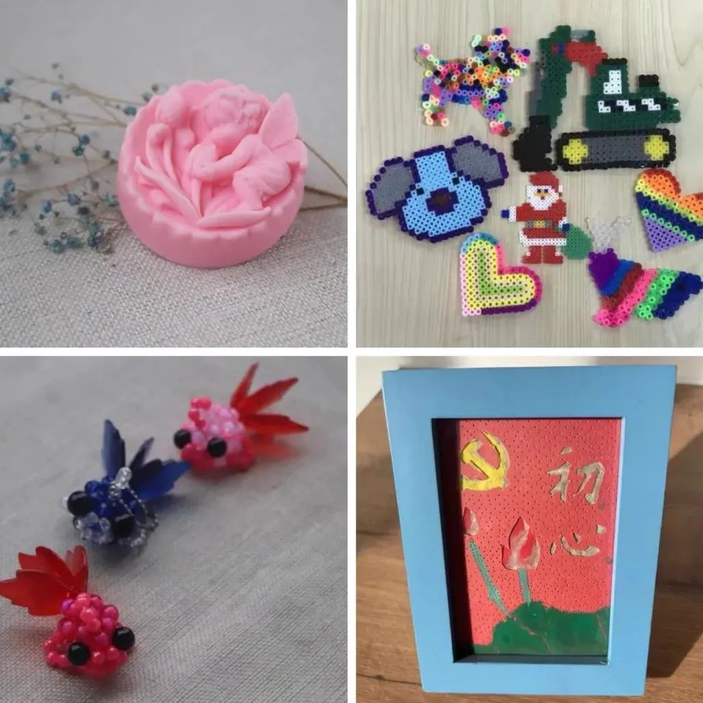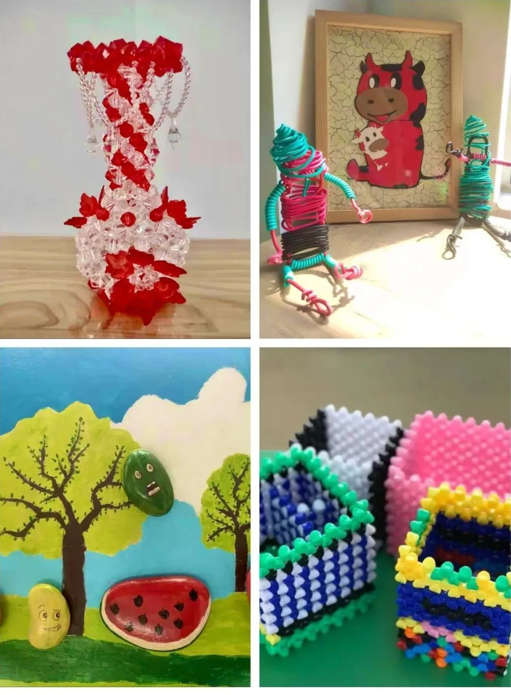 △孩子們的手工藝品:手工皂、拼豆、串珠、非遺“硤石燈彩”雕刻畫