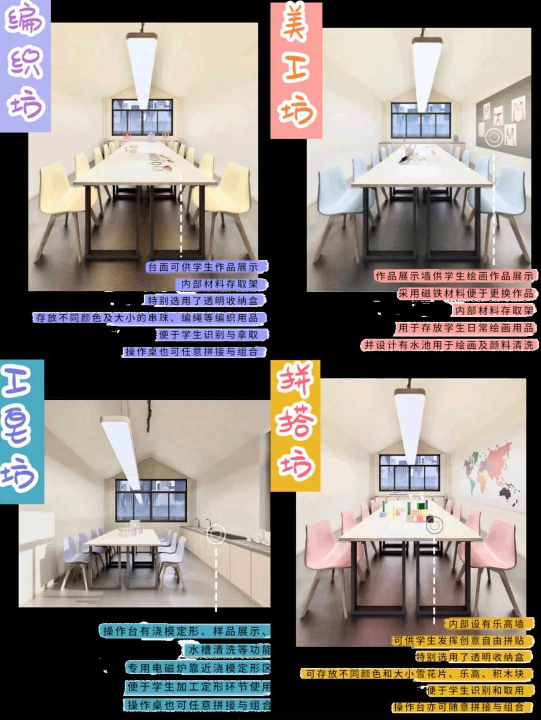 彩虹坊根據不同功能需求,分為教學區、作品展示區、多功能活動區和工具間,其中教學區包括拼搭坊、編織坊、美工坊、工皂坊四間手工教室。