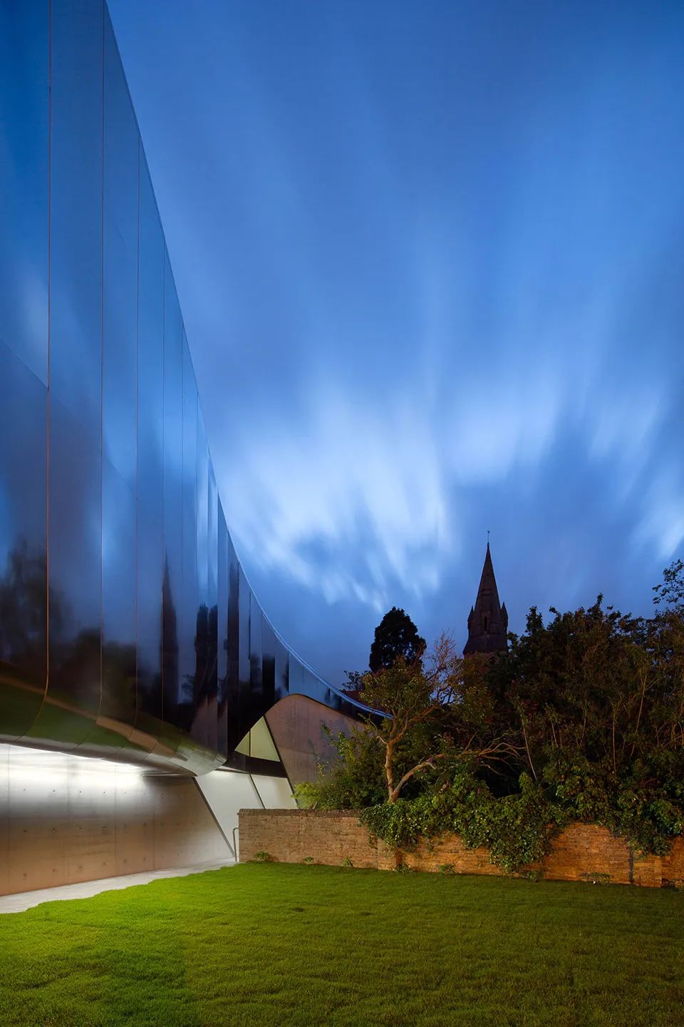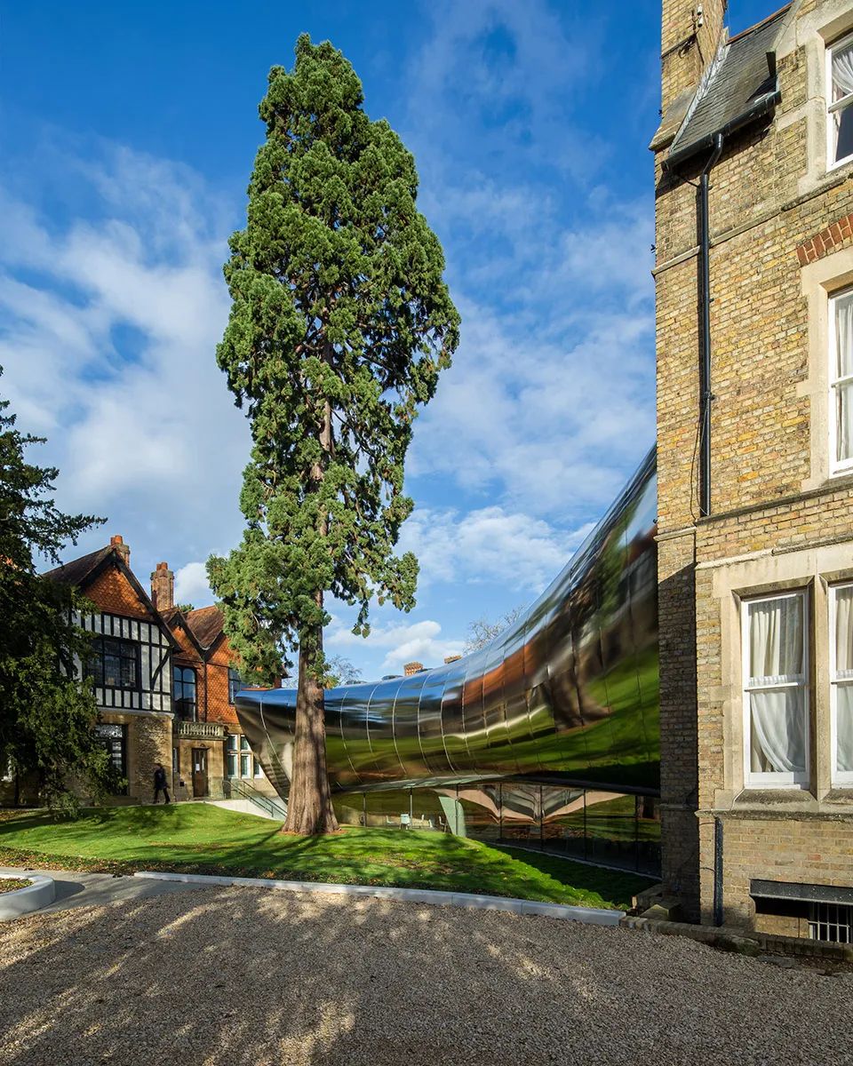 它蜿蜒穿過圣安東尼學院內限制建設的節點,把歷史保護建筑和古樹名木連接整合起來。立面不銹鋼的鏡面材質柔和地反射自然光線,回應著周圍的建筑肌理。
