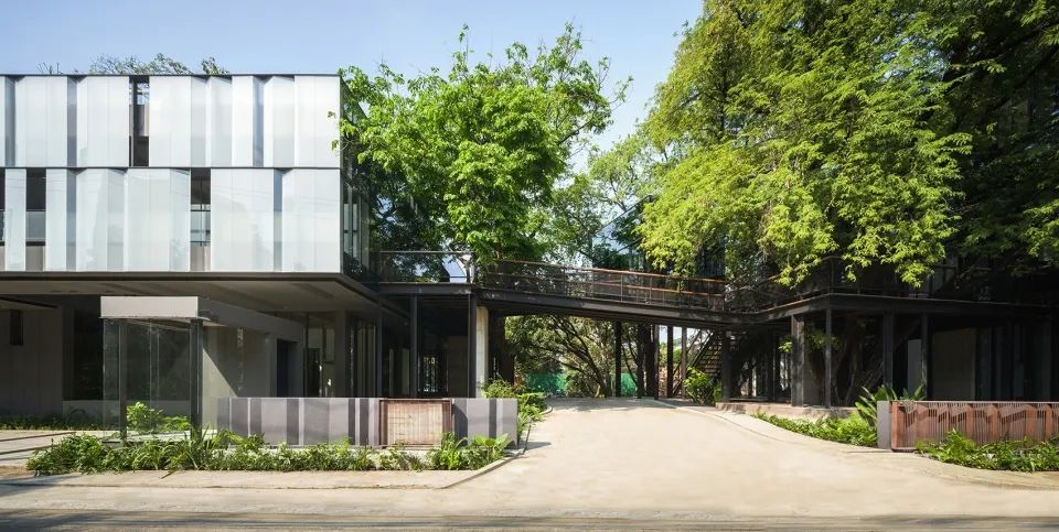 朝向街道的東南立面是一個半透明的雙層立面,能夠過濾并減少流入建筑內部的光熱。半透明的立面朝著入口的方向逐漸由光滑轉變為折疊的效果,其圖案模仿了陽光透過樹冠后投下的光影,指示出內部隱藏的樹林。