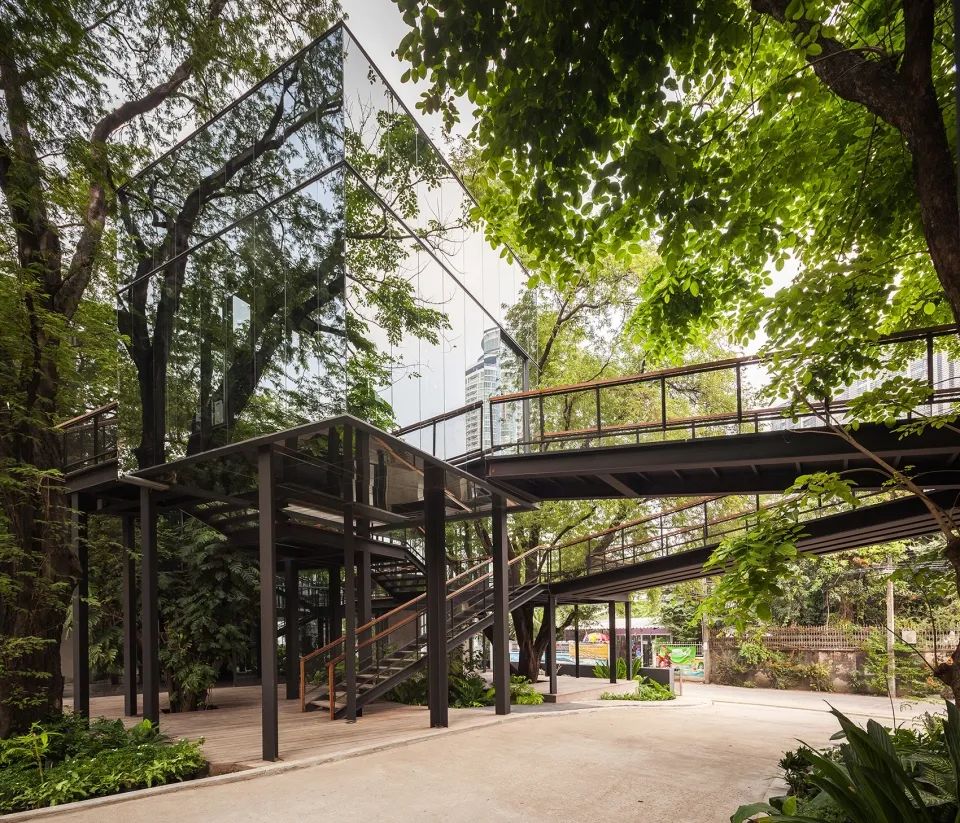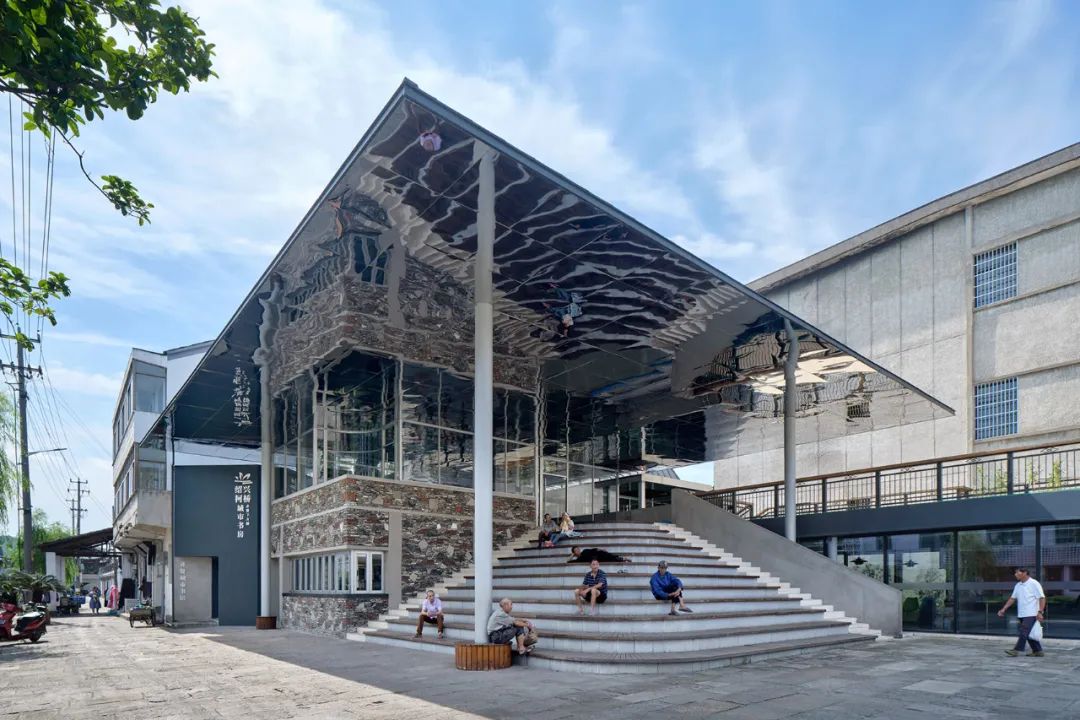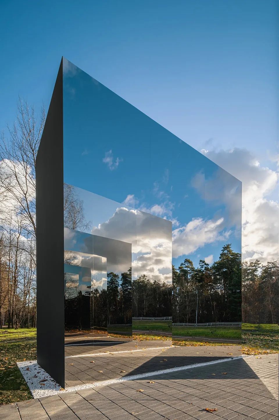 隈研吾曾在《負建筑》中寫道:“建筑自身存在的形體是可恥的。我想讓建筑的輪廓曖昧化,也就是說,讓建筑物消失。”?采用鏡面材料無疑是一種最直接地將建筑消隱于環境中的設計手法。