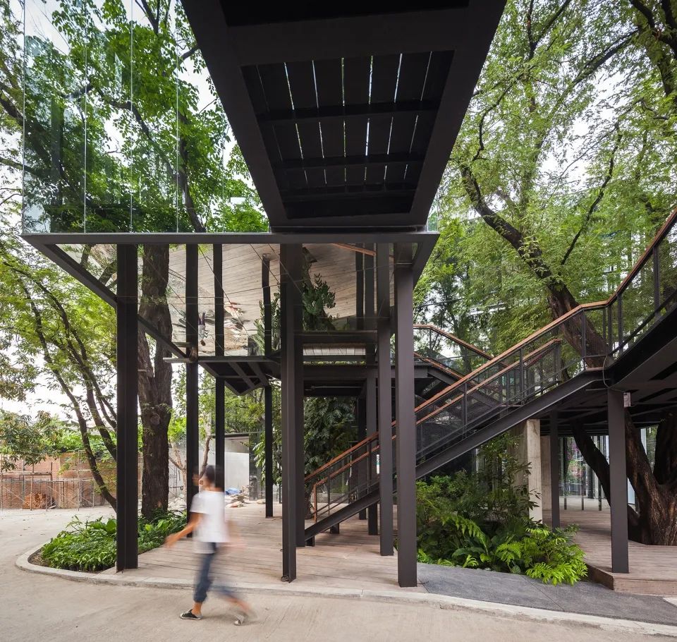 該項目共涵蓋2000平方米的辦公及零售空間,分為A棟和B棟兩個主要的體量,并分布在場地兩邊,為中間留出以樹為核心的開放式庭院。