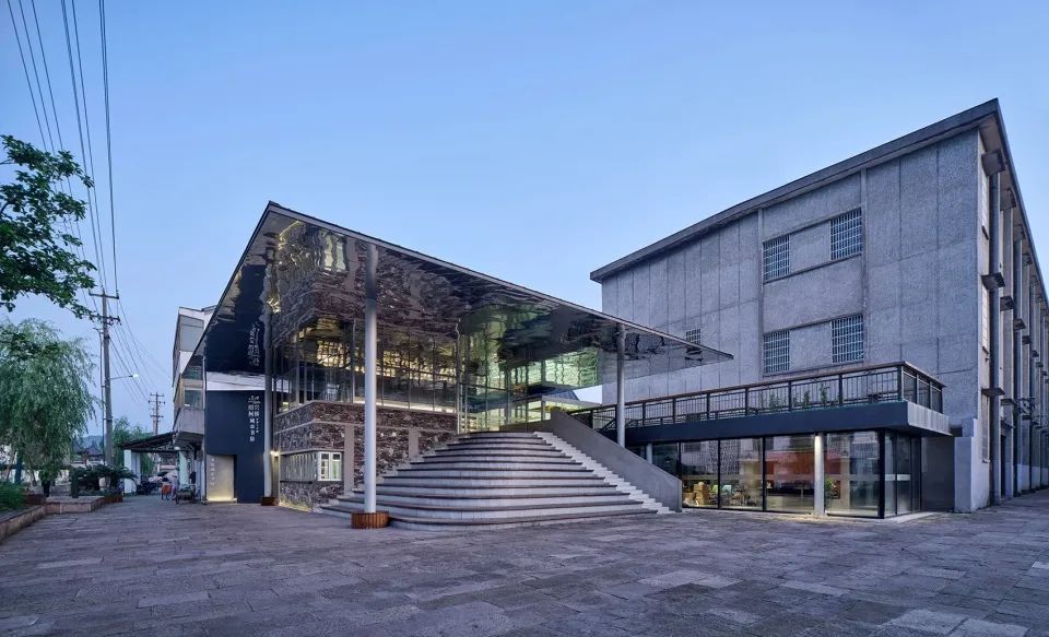 建成投入使用后,鏡面雨蓬下的大臺階成為鎮上居民乘涼、閑聊、打發時間的理想去處。白天這里是下方橋水街的公共客廳,到了周末傍晚,鎮政府會在此播放露天電影,居民聚集在一起,形成了一個以城市書房為背景的社區公共電影院。