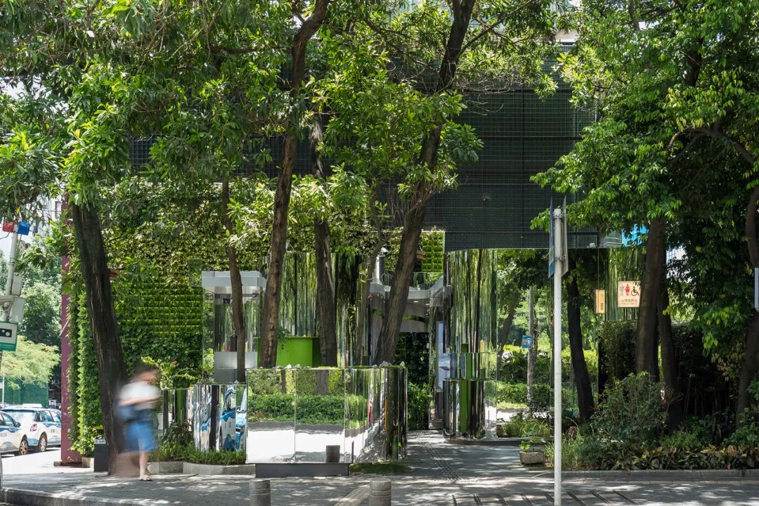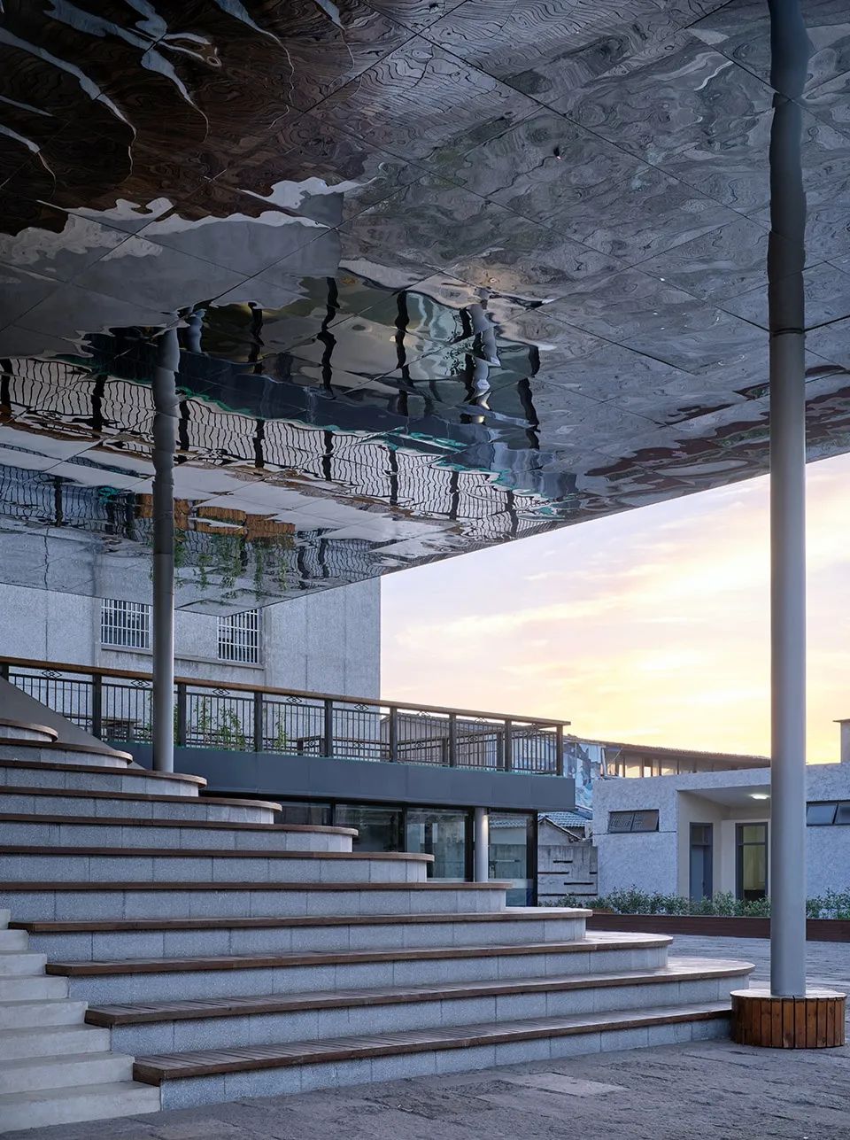 設計在立面上采用8K鏡面不銹鋼材質,其外觀隨著光線的更替,四時的變化呈現出不同景象。建筑與周邊的景物交織在一起,既和諧地共存著,又似消隱于樹林掩映中。