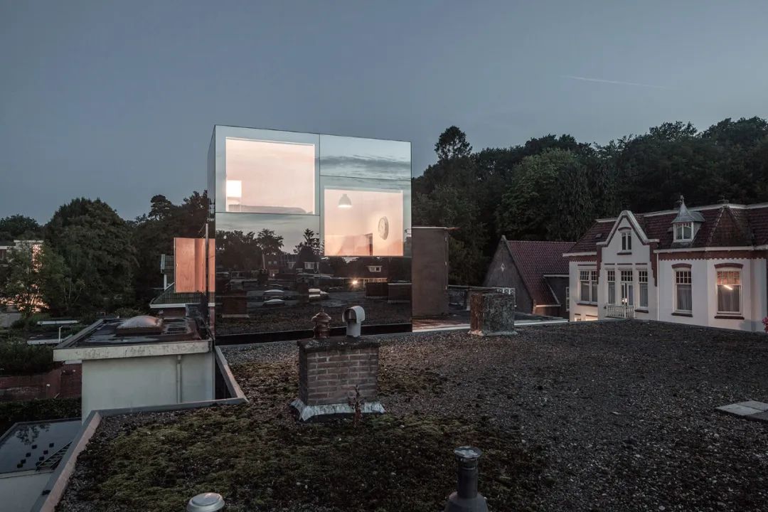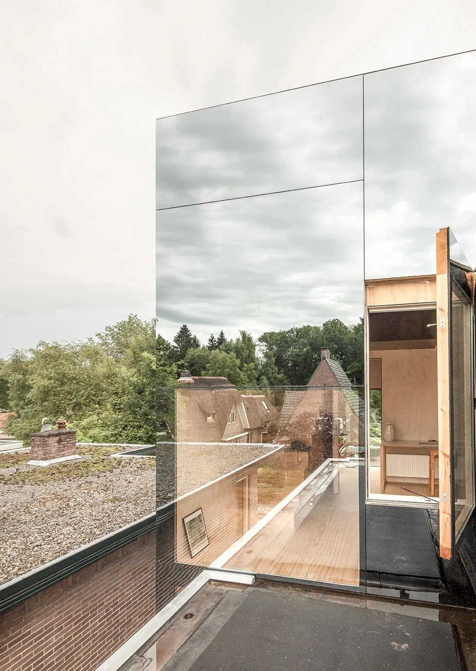 鏡子屋是一個建造在一座荷蘭小城市的屋頂延展裝置。這個裝置的安置主體是一個12歲男孩的臥室。設計采用樹屋的理念,旨在建造一個空中的私人空間。理念設計中的鋼床浮于屋頂三米高處。這里可以俯視周圍的房頂,煙囪,花園和樹木。