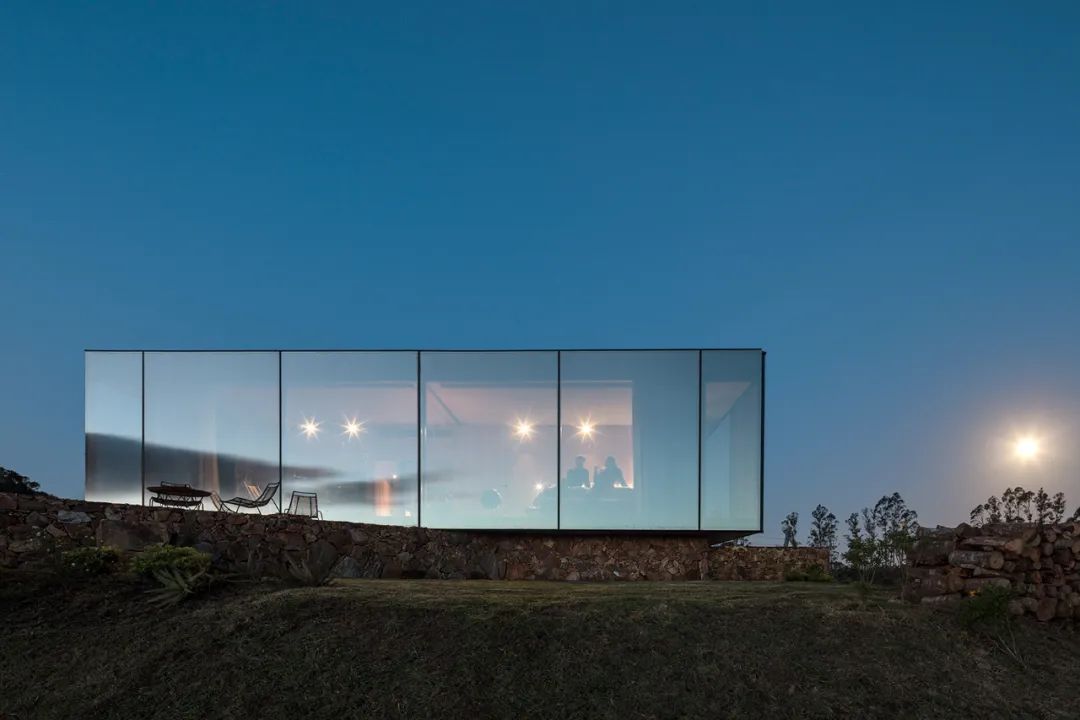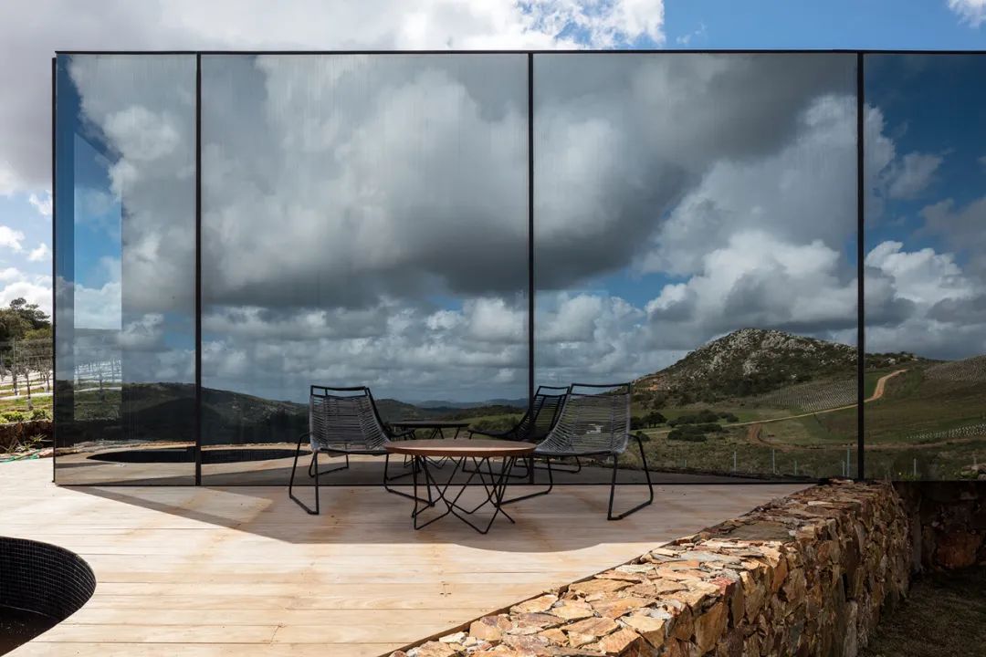 而面向農莊的西側,則是完全的鏡面玻璃墻。建筑涂上了UV圖層防止鳥撞。這個鏡面度假小屋并沒有直接與一旁的老建筑爭相斗艷,而是融入了整個環境。