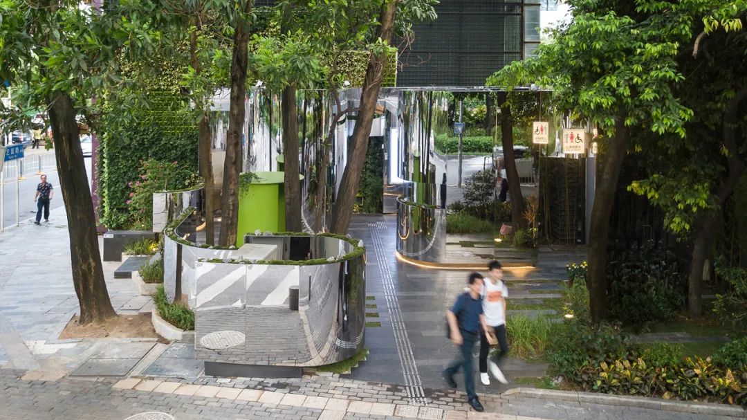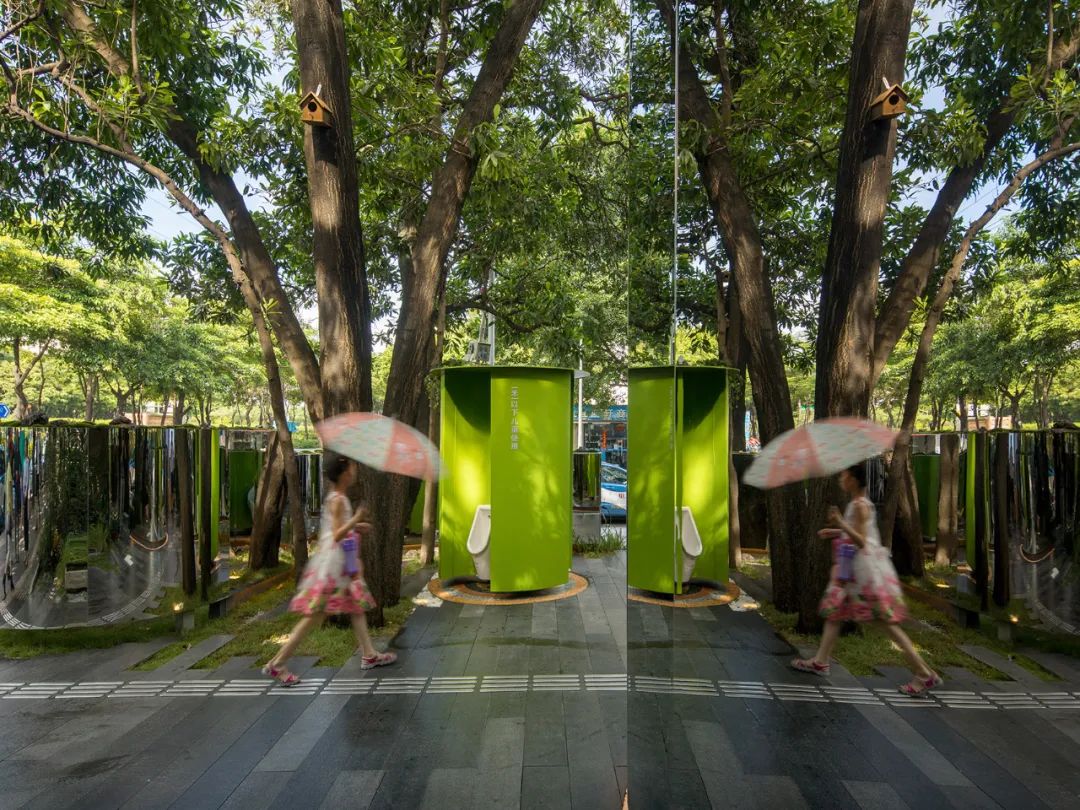 項目坐落于北環大道和藝園路交角,建筑師將這座設施消隱在原本樹林掩映的綠化帶中。廁所隔間采用無分性別隔間的形式,形成了一種無邊界的,與自然交融的流動型平面布局。