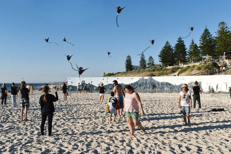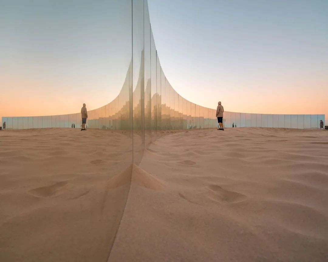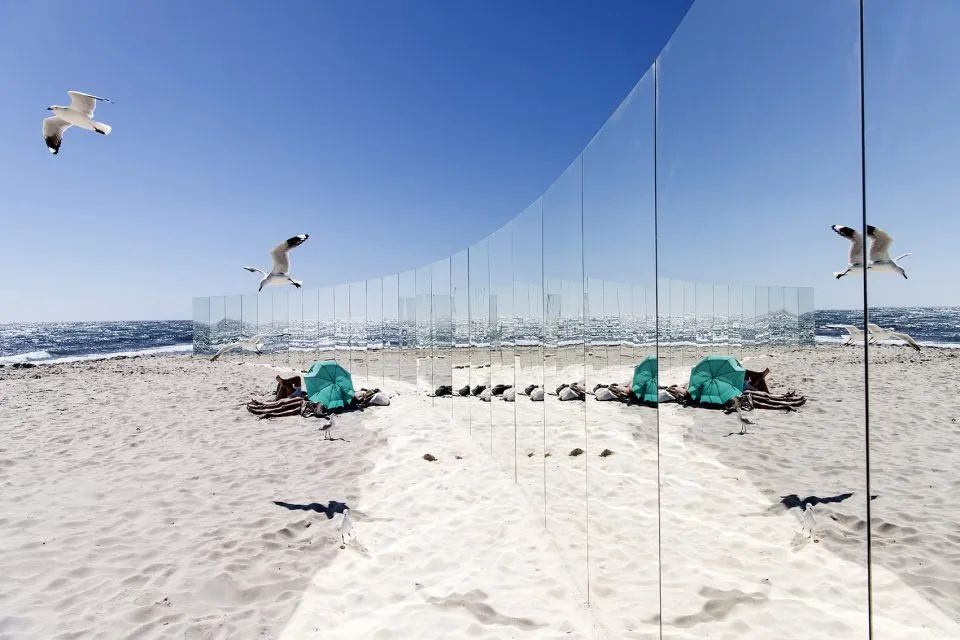 “沙漠島”是丹麥設計師事務所Gj?de & Partnere Arkitekter的裝置設計作品。該事務所將一座長72米的曲面鏡面墻搭建在印度洋沙灘上。