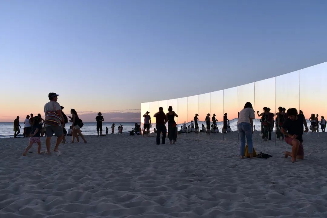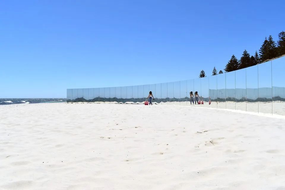 該曲面鏡面墻以直徑為60米的圓為原型,將廣袤的印度洋景觀映射在自身。彎曲的鏡面將沙灘向遠處延展,海平線在鏡面上浮動,讓人仿佛置身于一座孤島。