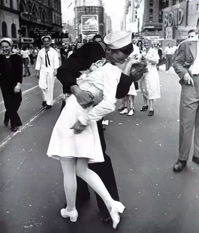 但這張照片卻被人多次質疑只是擺拍的照片而非抓拍的新聞照片,其拍攝日期并非1945年8月15日的“勝利日”,而是1945年5月8日的歐洲勝利日。