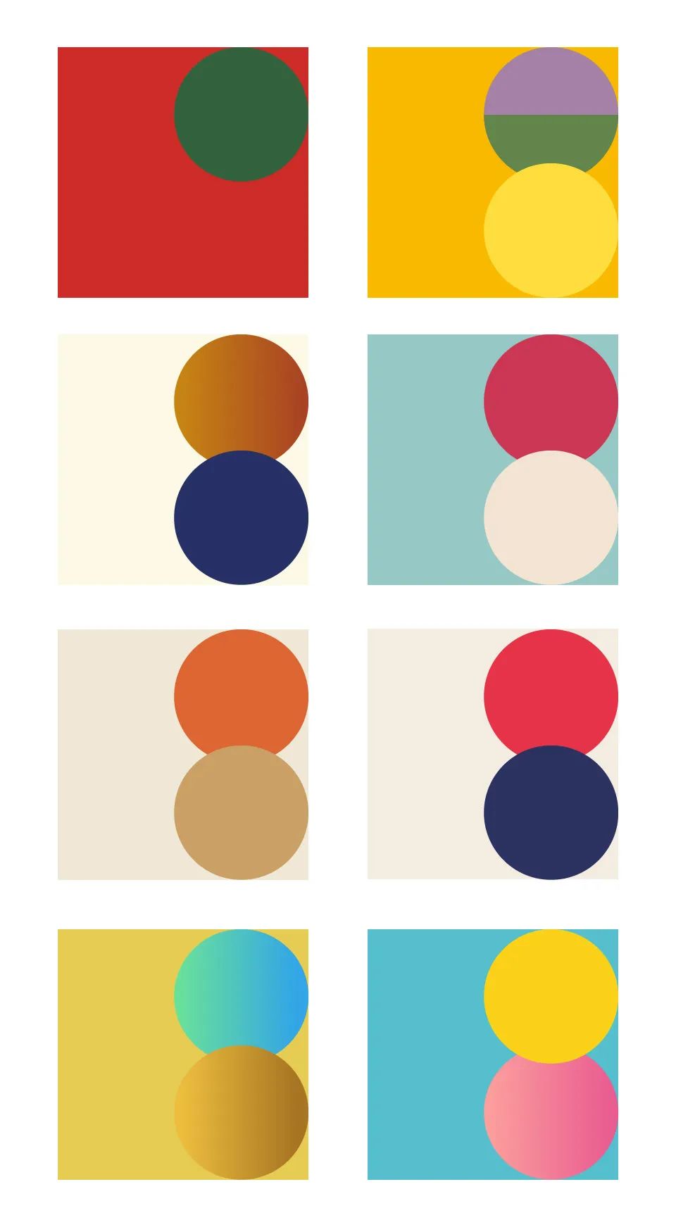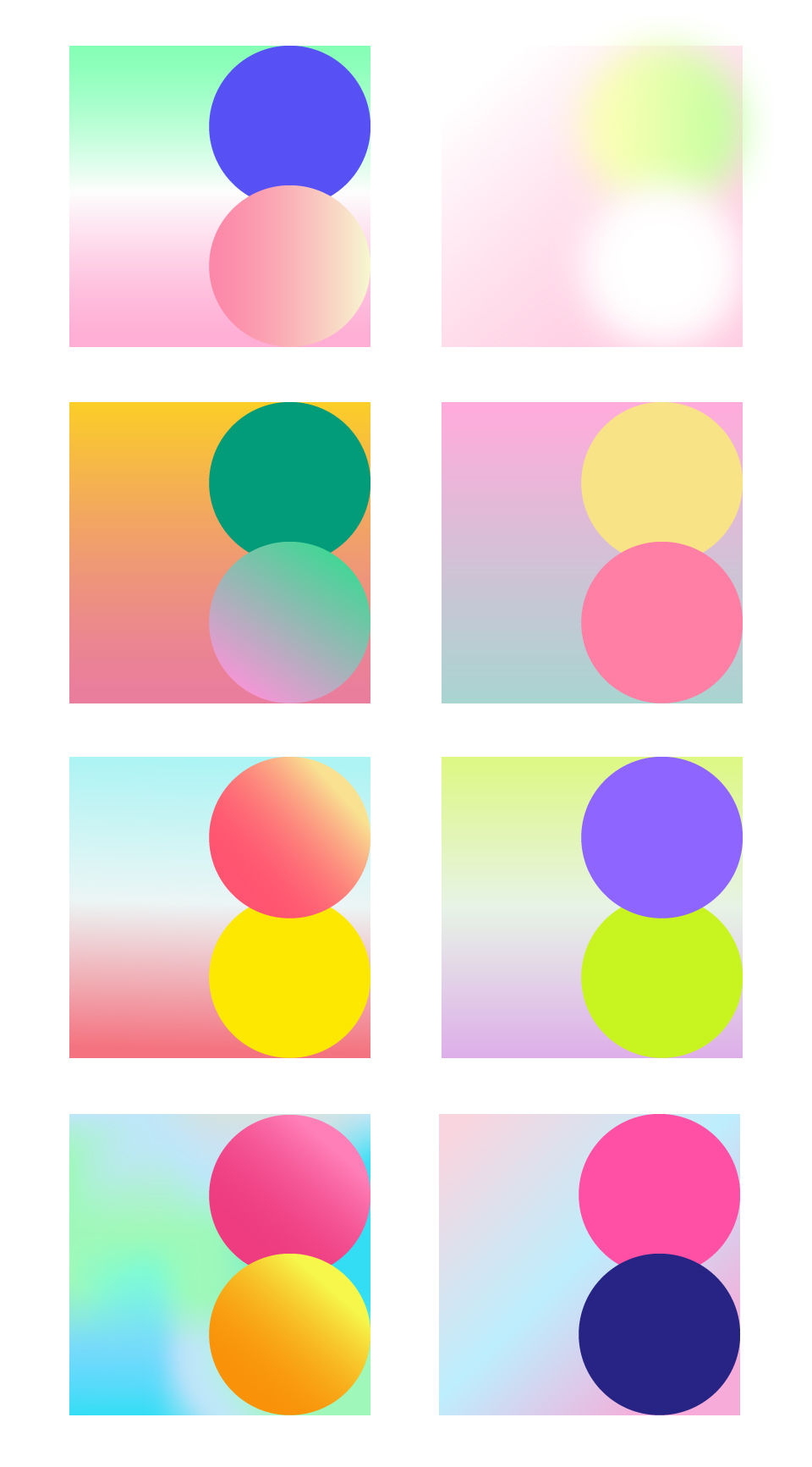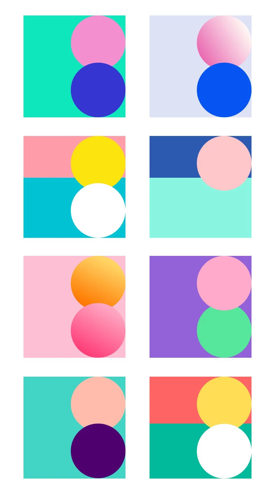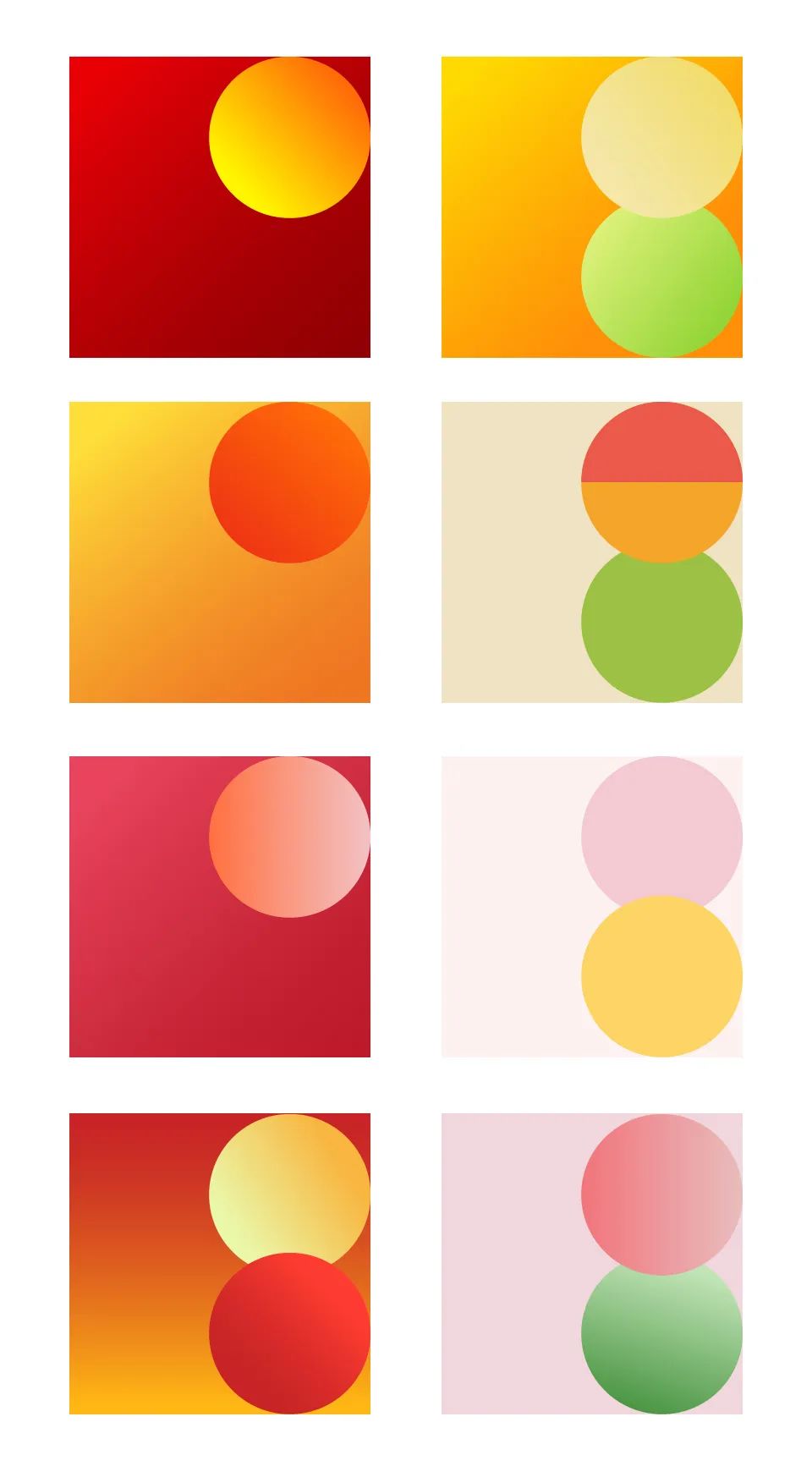 以上所列舉的色彩組合,矩形色塊為背景色,圓形色塊為畫面中圖片元素或文字使用的顏色。根據需要可以把其中的某些純色轉變為單色漸變,或者也可以把某些單色漸變轉化為純色。另外,在不包含黑白灰的色彩組合里,仍可以根據需要自行加入黑白灰,比如用于填充文字的顏色。
