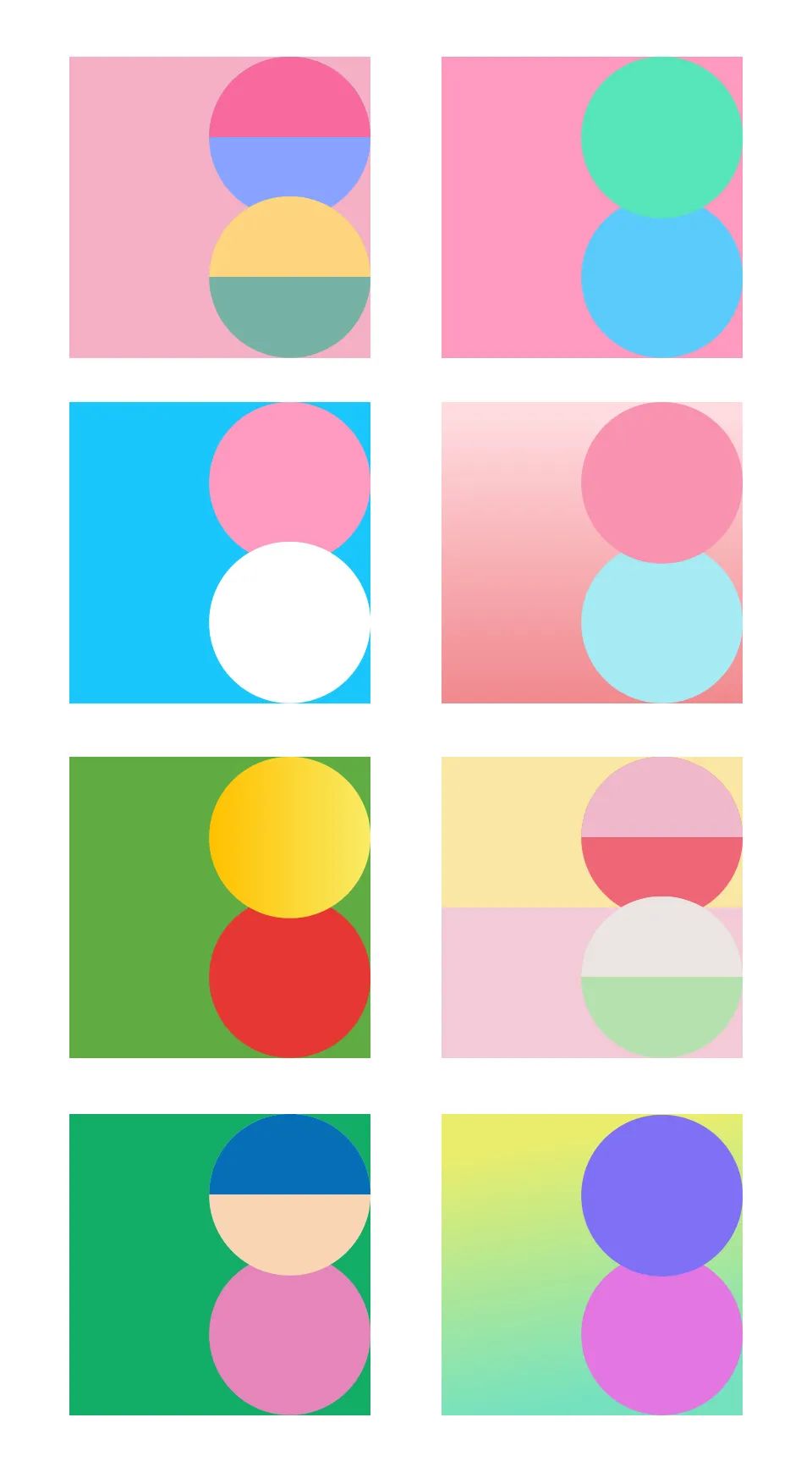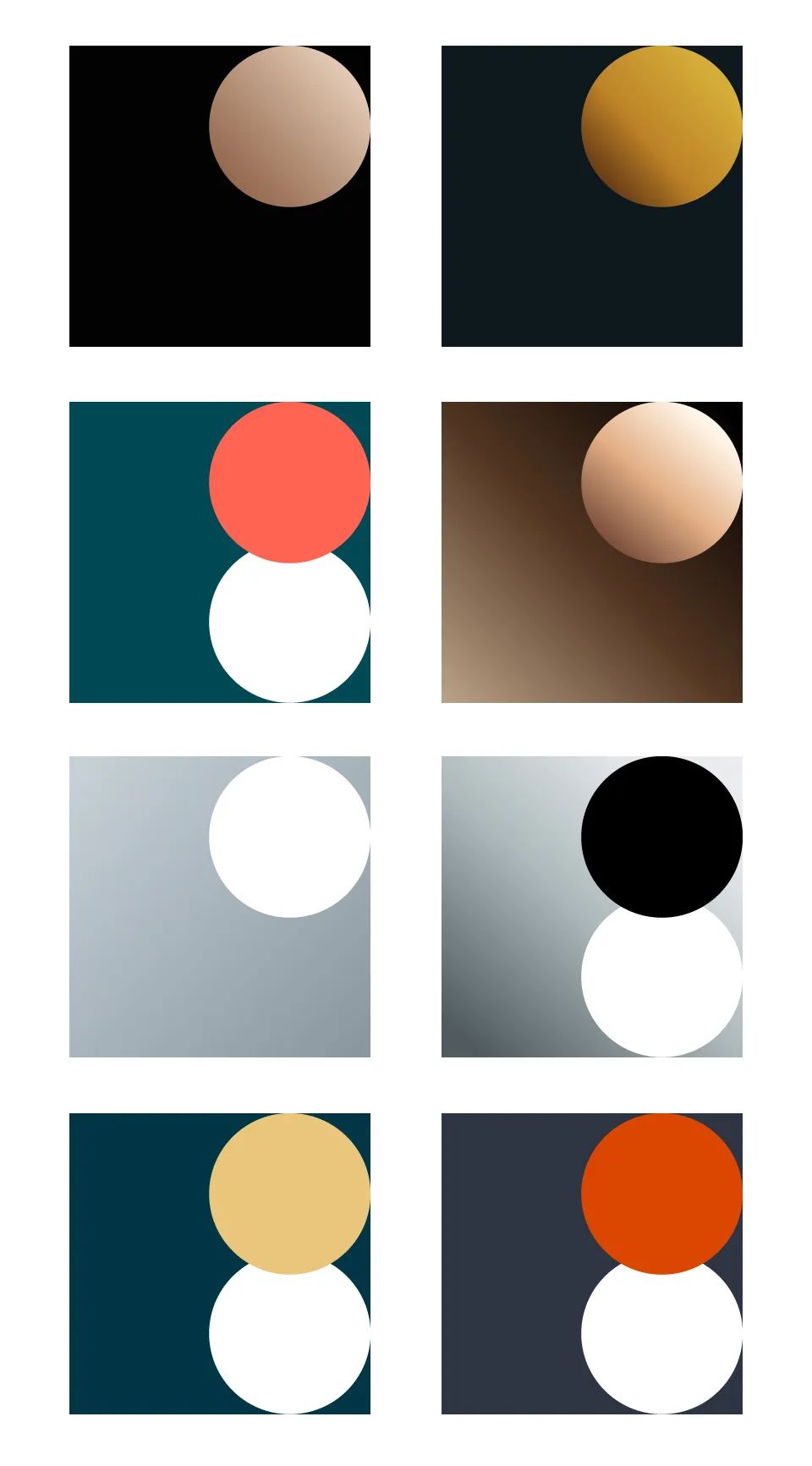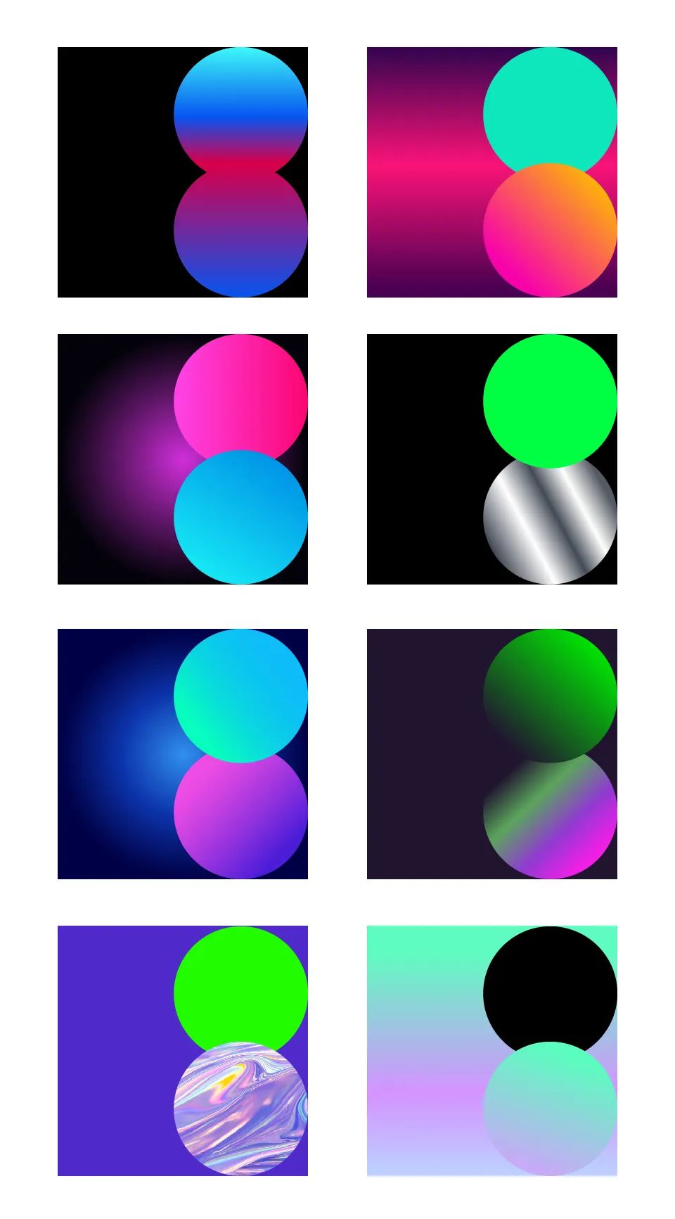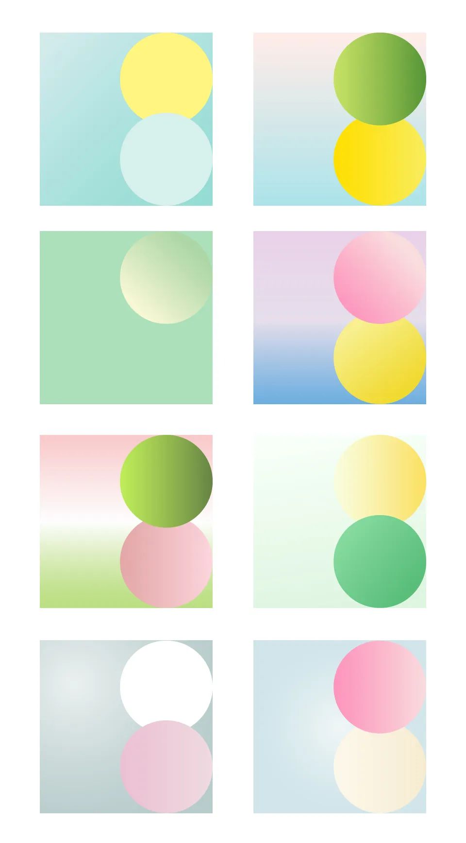 以上所列舉的色彩組合,矩形色塊為背景色,圓形色塊為畫面中圖片元素或文字使用的顏色。根據需要可以把其中的某些純色轉變為單色漸變,或者也可以把某些單色漸變轉化為純色。另外,在不包含黑白灰的色彩組合里,仍可以根據需要自行加入黑白灰,比如用于填充文字的顏色。