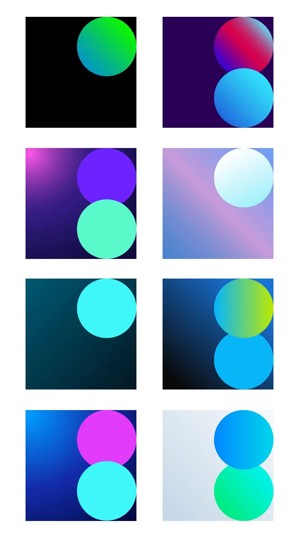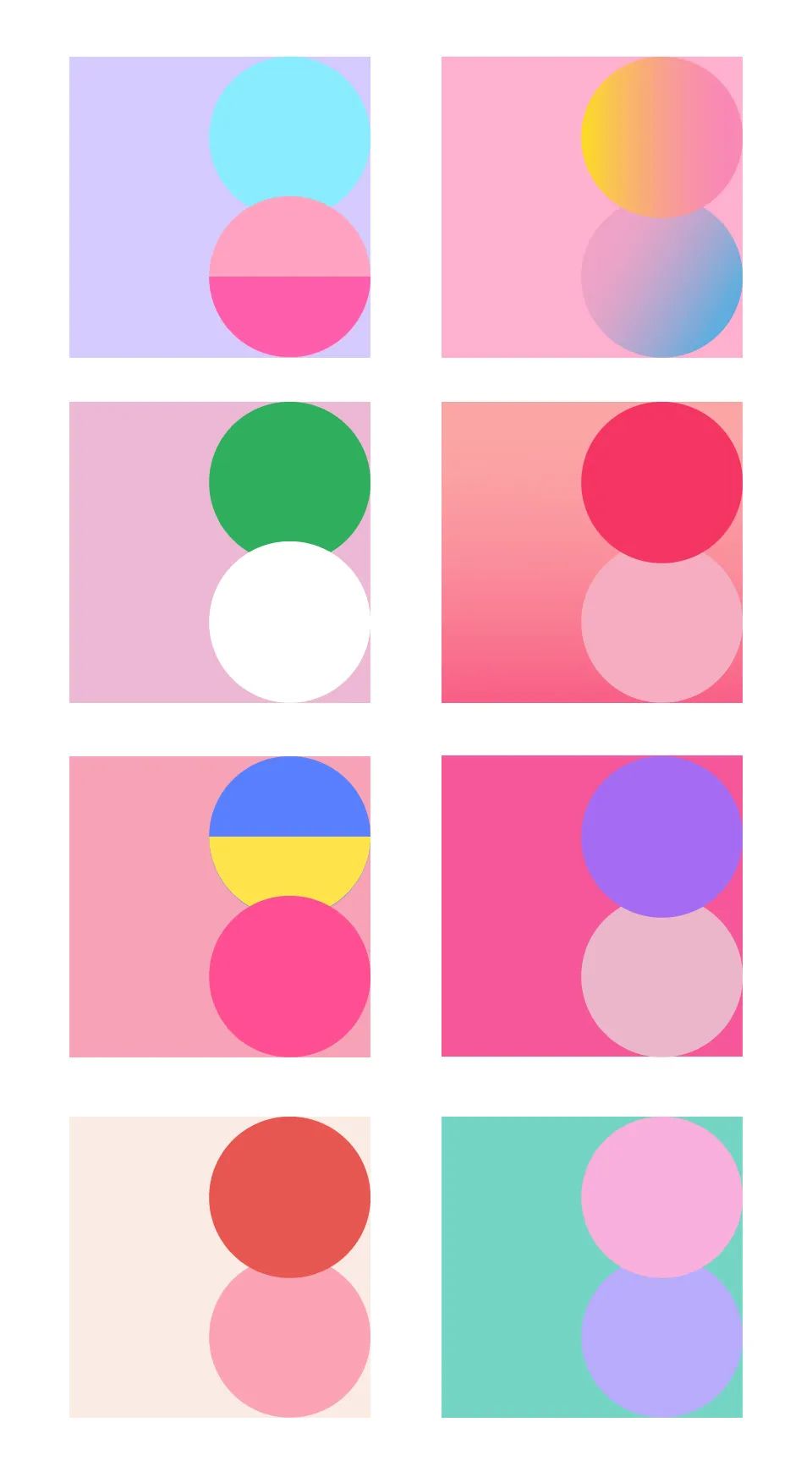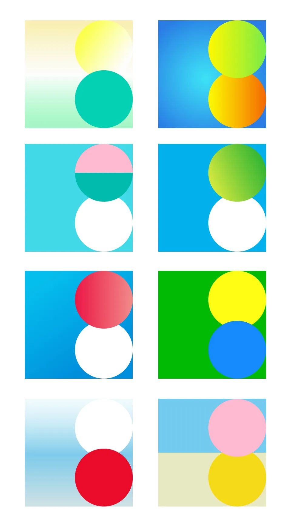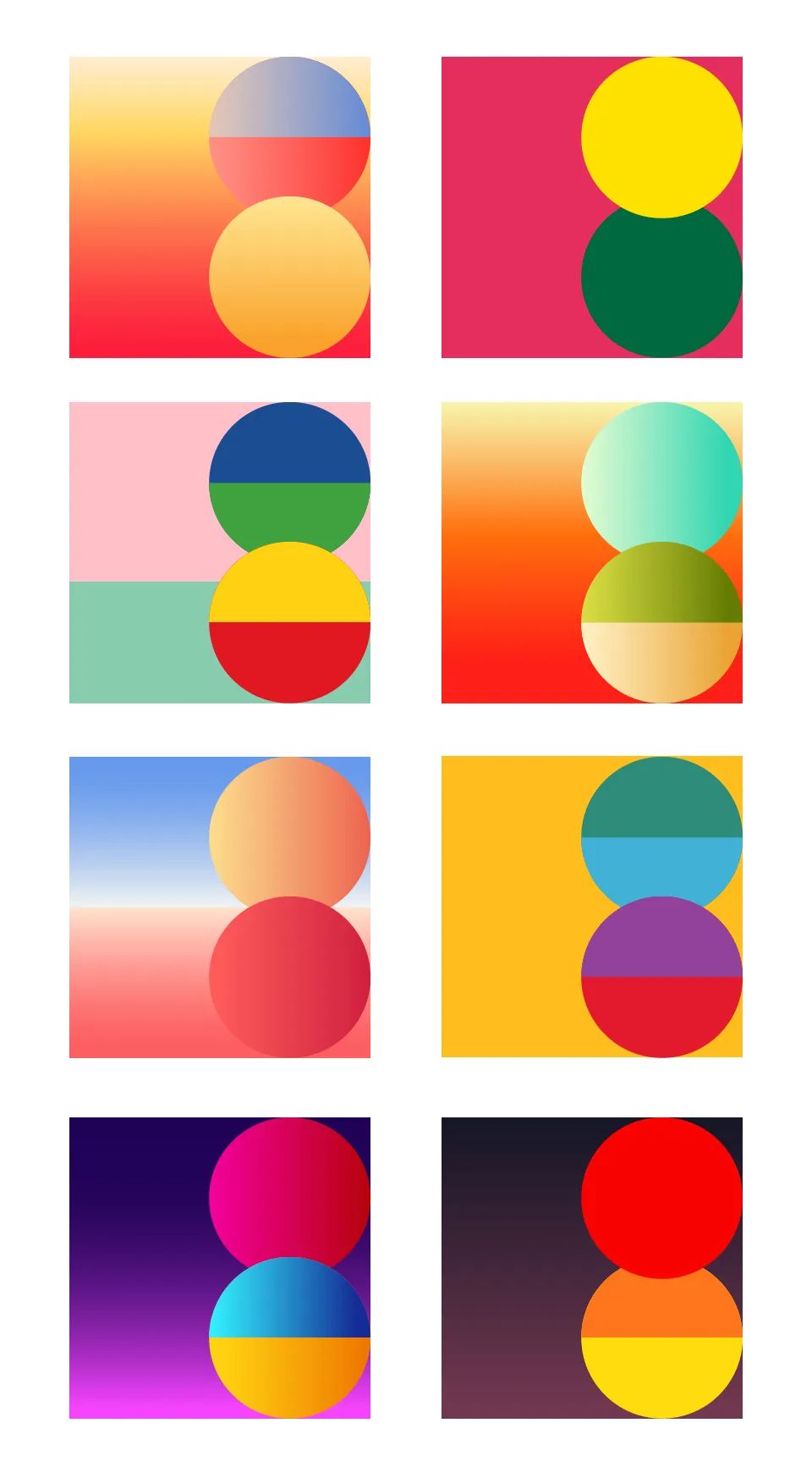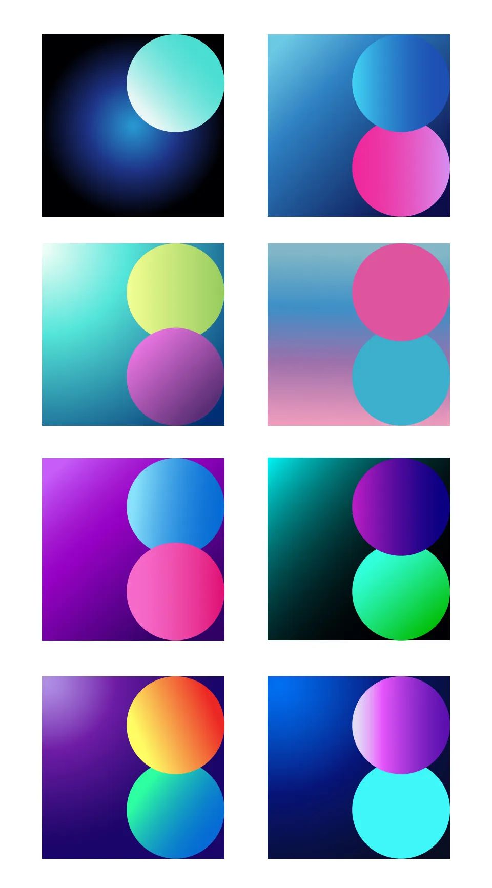 以上所列舉的色彩組合,矩形色塊為背景色,圓形色塊為畫面中圖片元素或文字使用的顏色。根據需要可以把其中的某些純色轉變為單色漸變,或者也可以把某些單色漸變轉化為純色。另外,在不包含黑白灰的色彩組合里,仍可以根據需要自行加入黑白灰,比如用于填充文字的顏色。