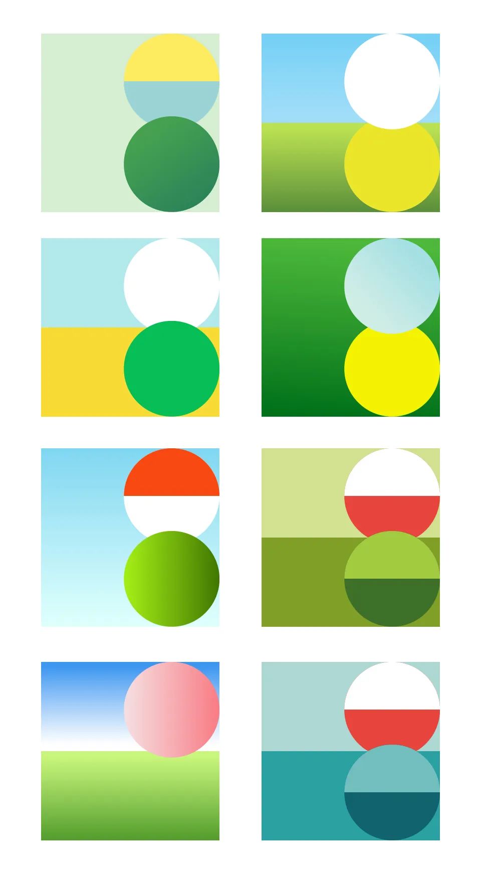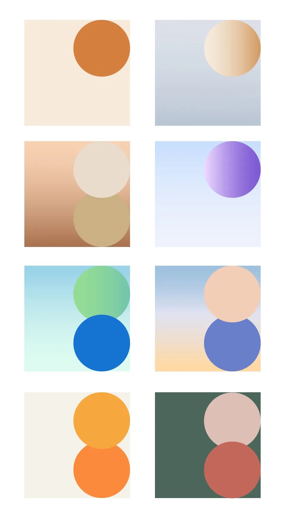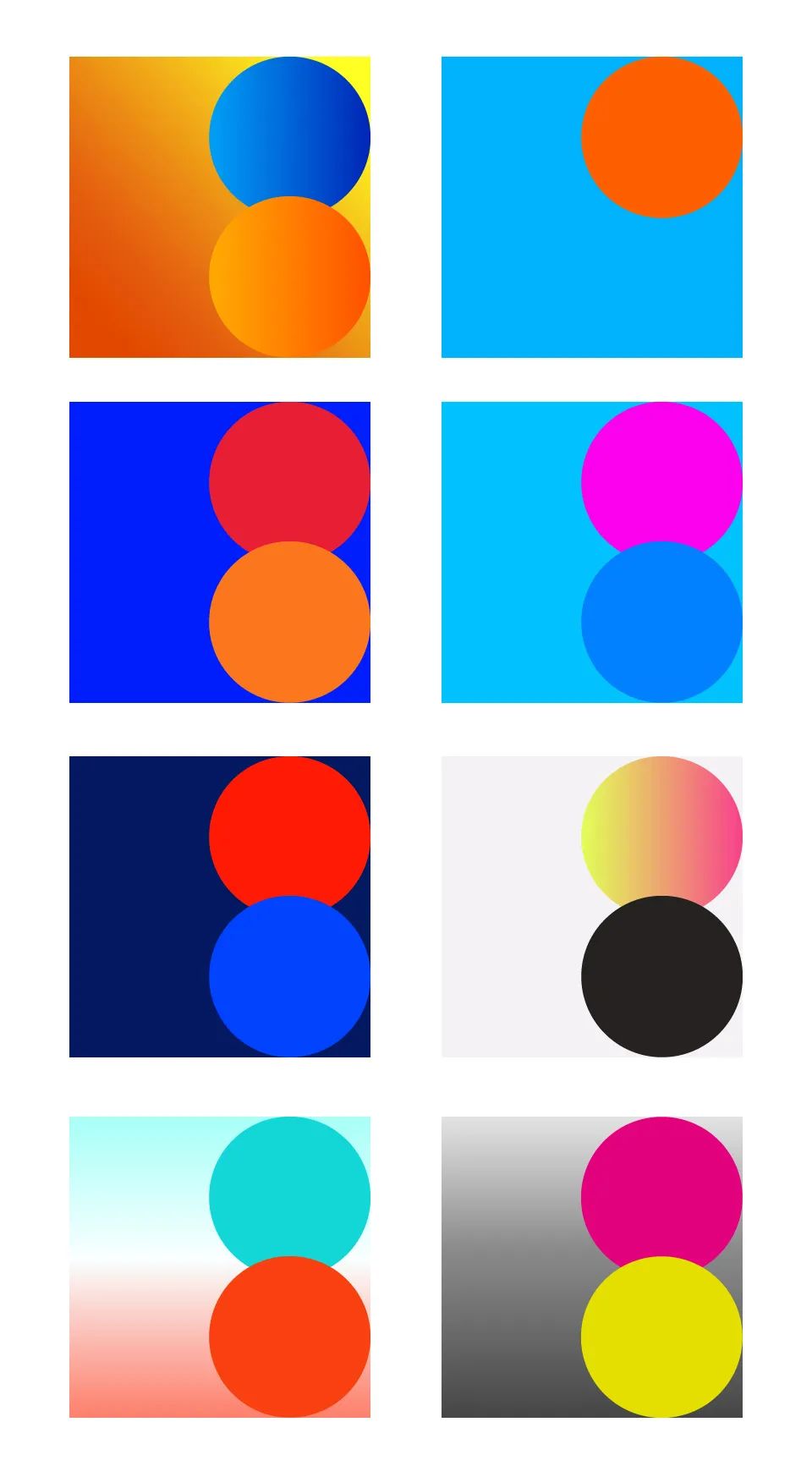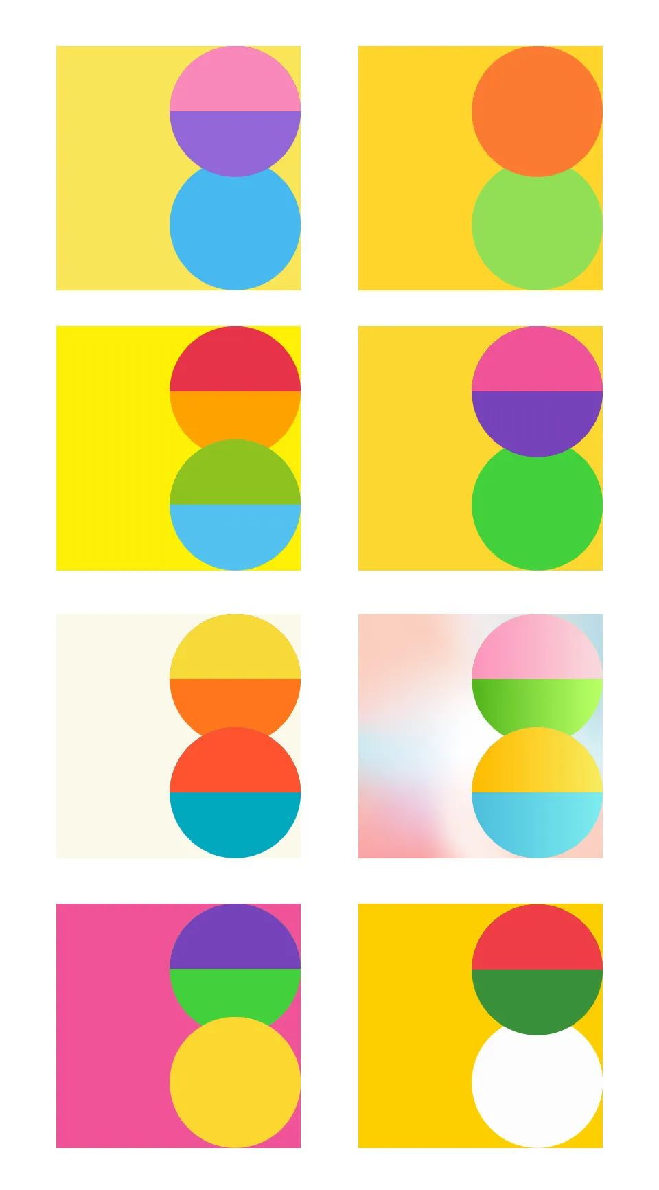以上所列舉的色彩組合,矩形色塊為背景色,圓形色塊為畫面中圖片元素或文字使用的顏色。根據需要可以把其中的某些純色轉變為單色漸變,或者也可以把某些單色漸變轉化為純色。另外,在不包含黑白灰的色彩組合里,仍可以根據需要自行加入黑白灰,比如用于填充文字的顏色。