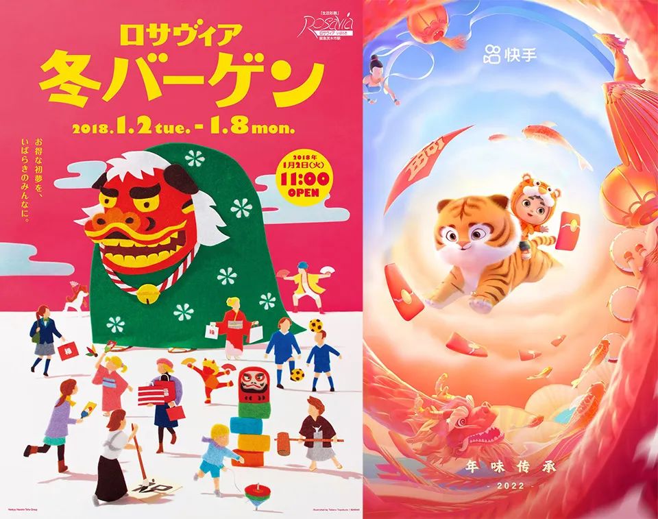 在設計節日海報或促銷海報時,通常需要表現出喜慶的調性,有些設計師會局限在大紅色、黃色、和橙色里,這樣搭配出來的色彩容易土,而想要解決這個問題,一方面可以加入冷色搭配使用,另一方面顏色的飽和度和亮度也不要過高。