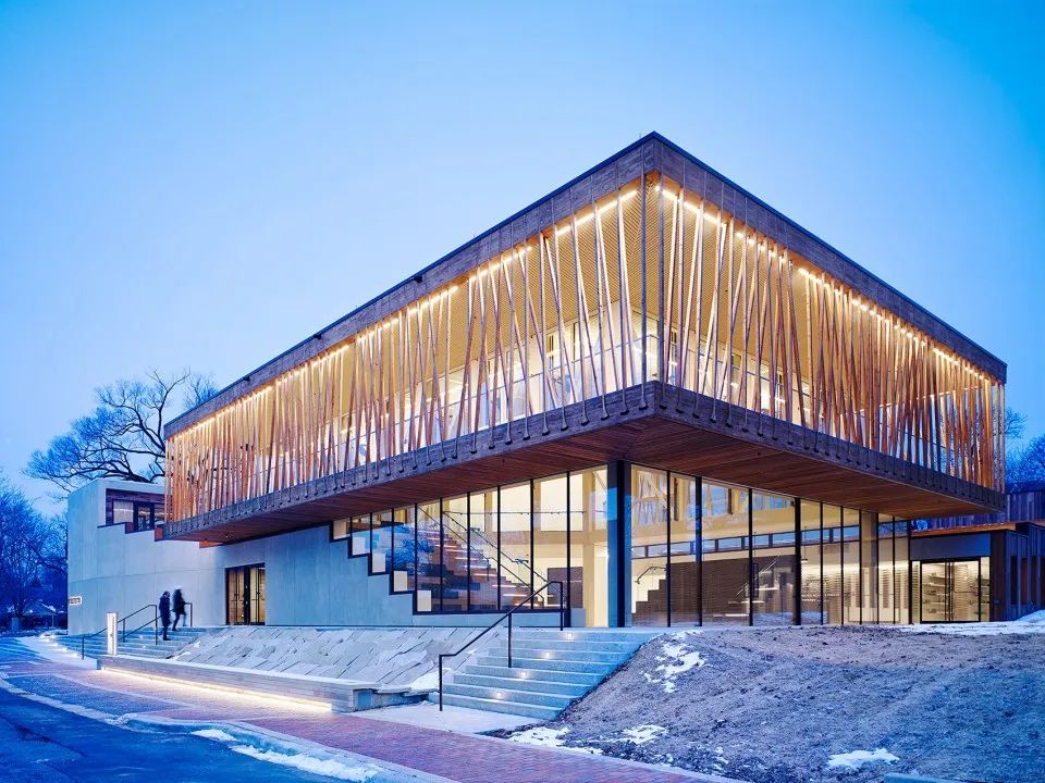建筑師珍妮·甘及其芝加哥事務(wù)所展示了其通過平常的材料來展示項(xiàng)目非凡性的能力。在這個(gè)建筑中,雪松、玻璃和混凝土等包覆材料使得建筑實(shí)現(xiàn)了極具現(xiàn)代性的簡(jiǎn)潔外形。值得一提的是,運(yùn)用較多的雪松材質(zhì)呈現(xiàn)木色,在天氣很好的時(shí)候,與周圍景色遙相呼應(yīng),將建筑的自然特質(zhì)表露無遺。在夜晚,建筑化身為矩形燈籠,仿佛是一座巨大的指路明燈。
