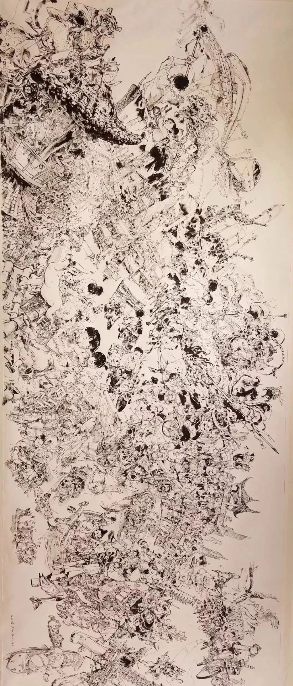 金政基的作品,多為黑白單色默寫,角色、場景、宇宙均有涉獵。2018年,他在廣州文華東方酒店辦了一場閉門繪畫演示,我讓同事專程前往,拍攝下他創(chuàng)作當(dāng)代中國《清明上河圖》的過程,非常震撼,現(xiàn)場吸引眾多動漫愛好者買票圍觀。在這幅長卷里,融合了中國的過去、現(xiàn)在、未來,一個基于現(xiàn)實又超越現(xiàn)實的中國。